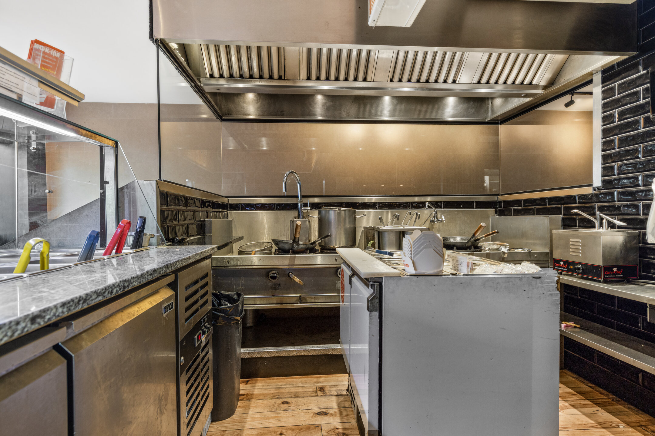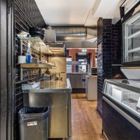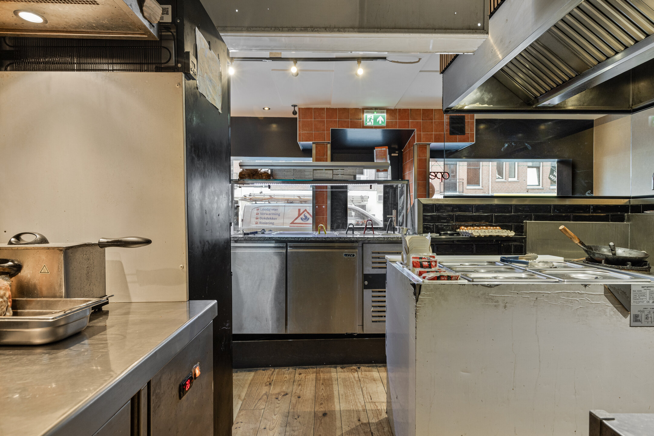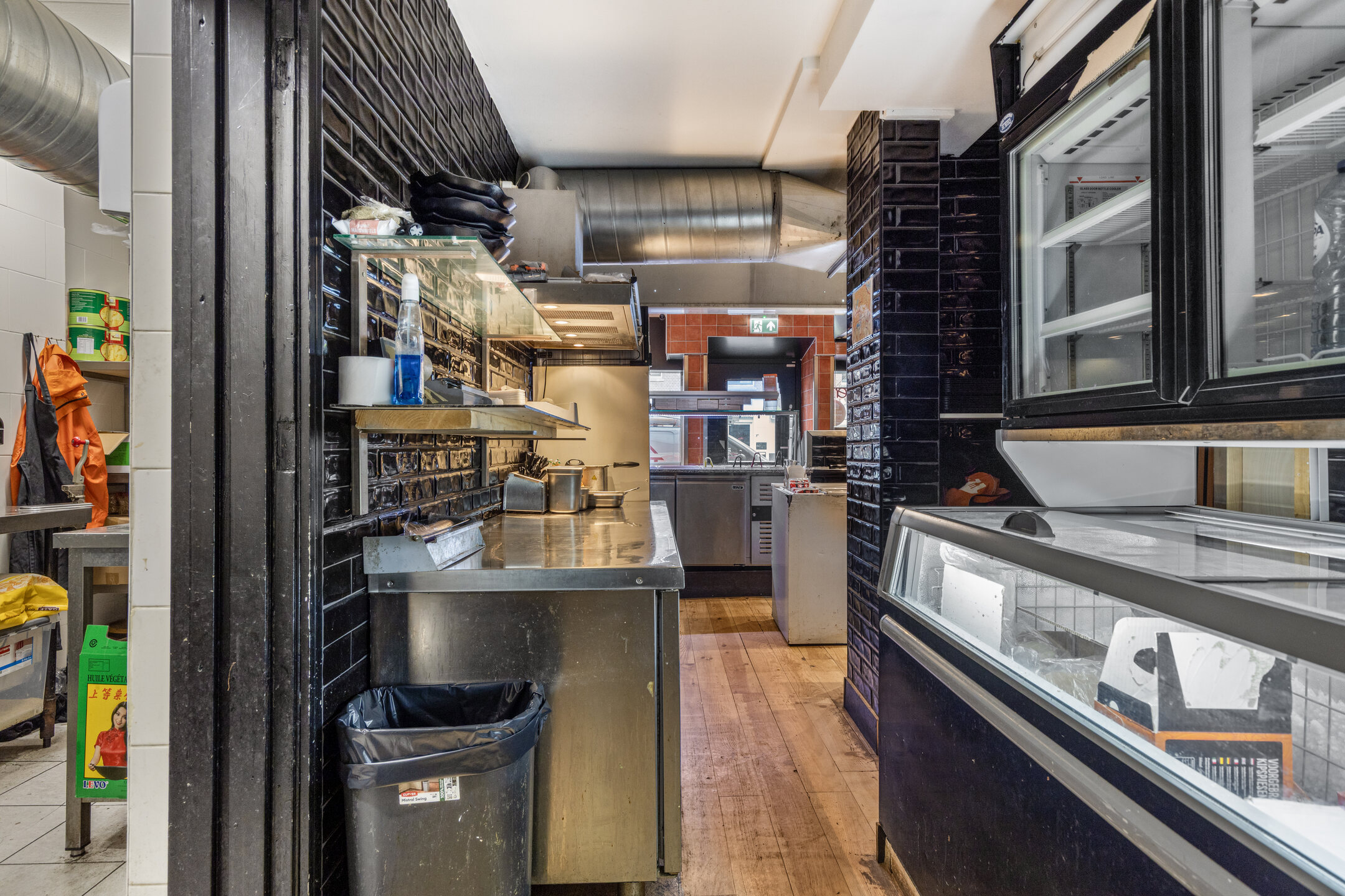 Aan de achterzijde bevinden zich ruime voorbereidingsruimten, koel- en vriesfaciliteiten, spoelvoorzieningen en opslag, waaronder een royale kelderruimte. De indeling sluit goed aan op een efficiënte afhaal- en bezorgexploitatie en biedt volop mogelijkheden voor voortzetting van het huidige concept of een andere invulling binnen de horeca.