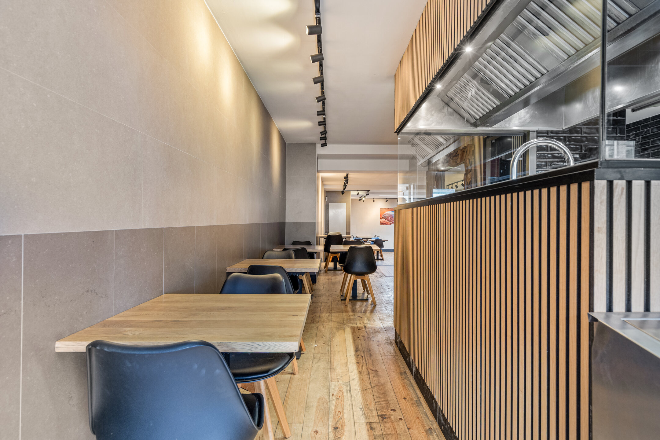 De zaak heeft een totale oppervlakte van circa 182 m² en is praktisch en overzichtelijk ingedeeld. Aan de voorzijde bevindt zich het afhaal- en bestelgedeelte met zitgelegenheid voor circa 70 gasten, aangevuld met enkele zitplaatsen aan de voorzijde. De open keuken is professioneel ingericht en voorzien van een afzuiginstallatie met afvoer naar het dak.