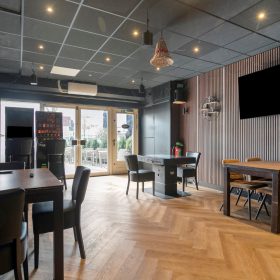 De zaak heeft een oppervlakte van circa 54 m² en beschikt over circa 20 zitplaatsen binnen. Aan de voorzijde bevindt zich een breed opgezet terras met circa 24 zitplaatsen, wat een belangrijk onderdeel vormt van de uitstraling en zichtbaarheid aan het plein.