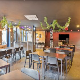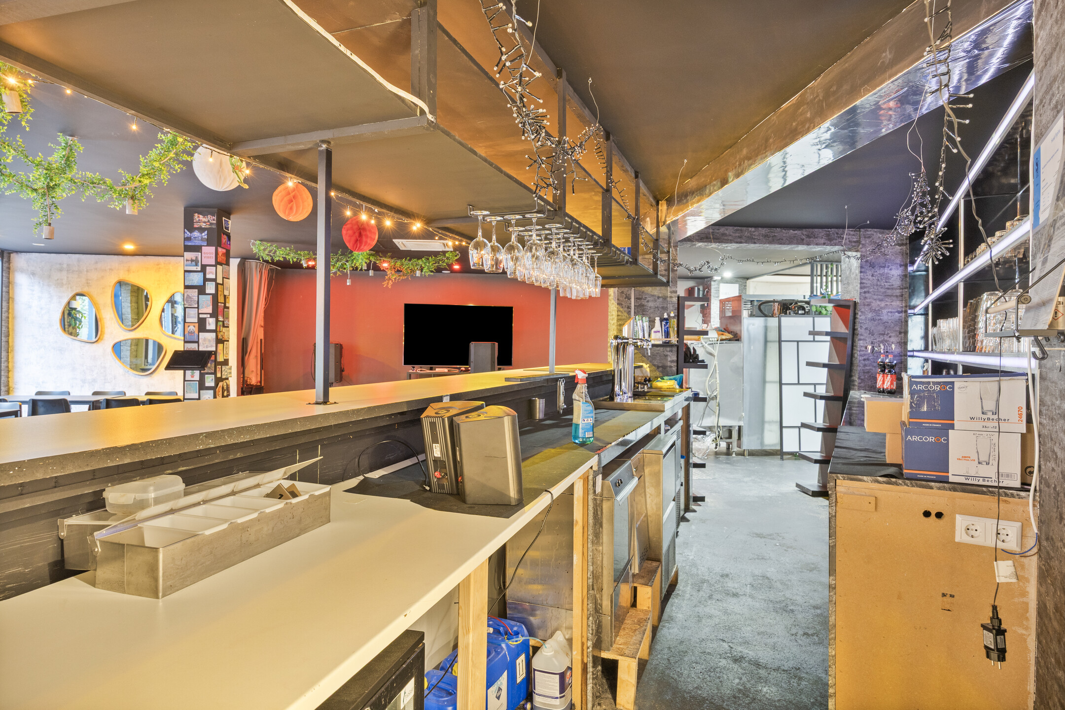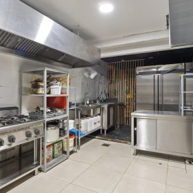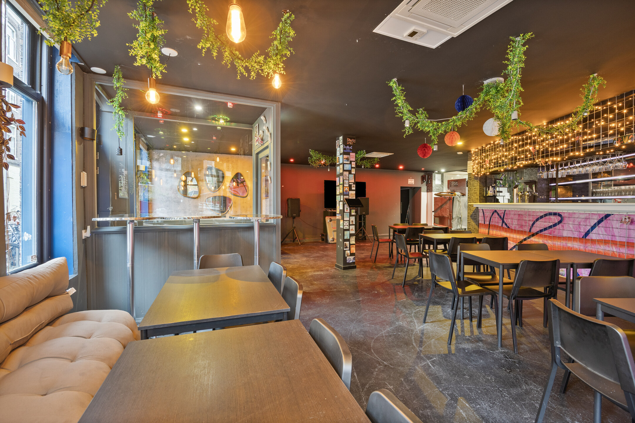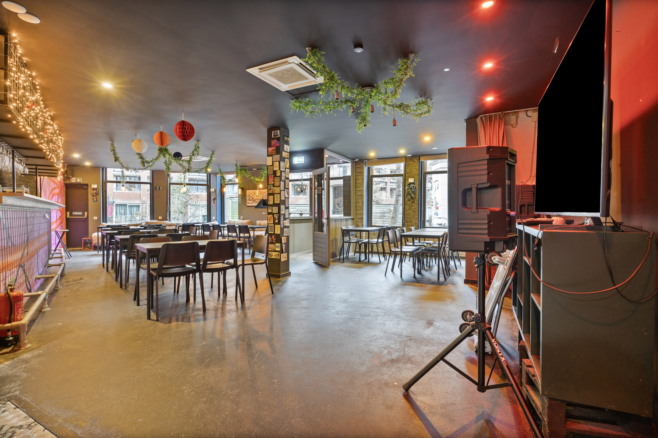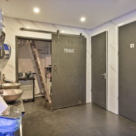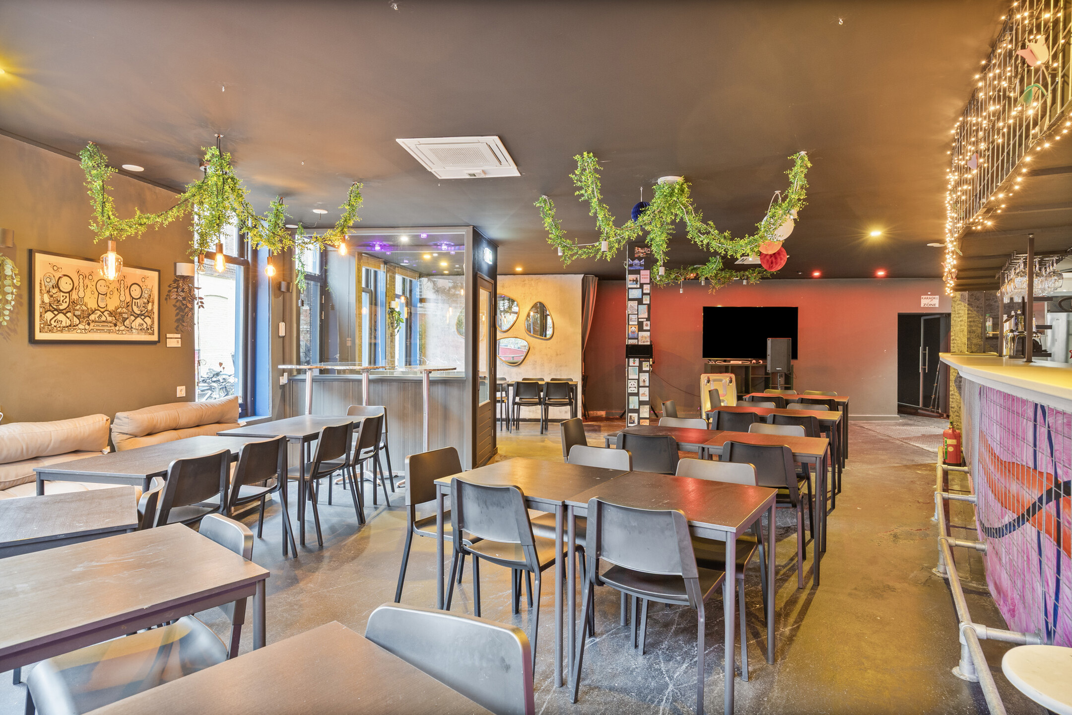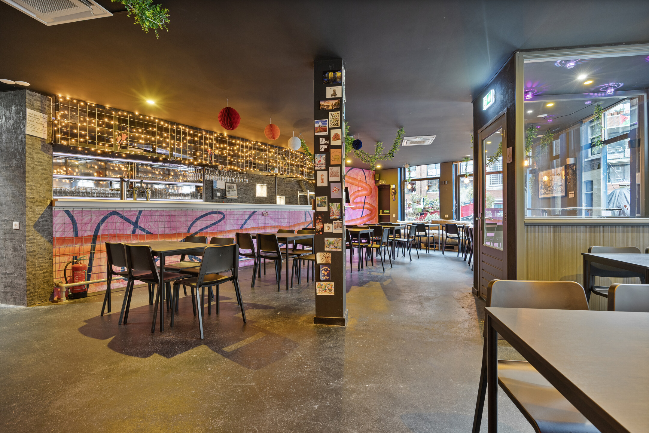 Het pand betreft een hoeklocatie en beschikt aan de voorzijde over brede raampartijen, wat zorgt voor veel natuurlijke lichtinval en een open uitstraling. De bedrijfsruimte is verdeeld over twee aaneengesloten ruimtes op de begane grond met een totale oppervlakte van circa 213 m². Daarnaast is er een kelder aanwezig, geschikt voor opslag en onder andere biertankinstallaties. Tevens is er ook een professionele keuken aanwezig.