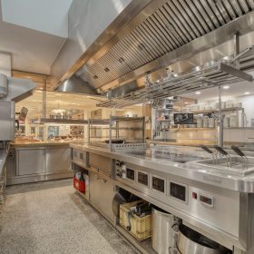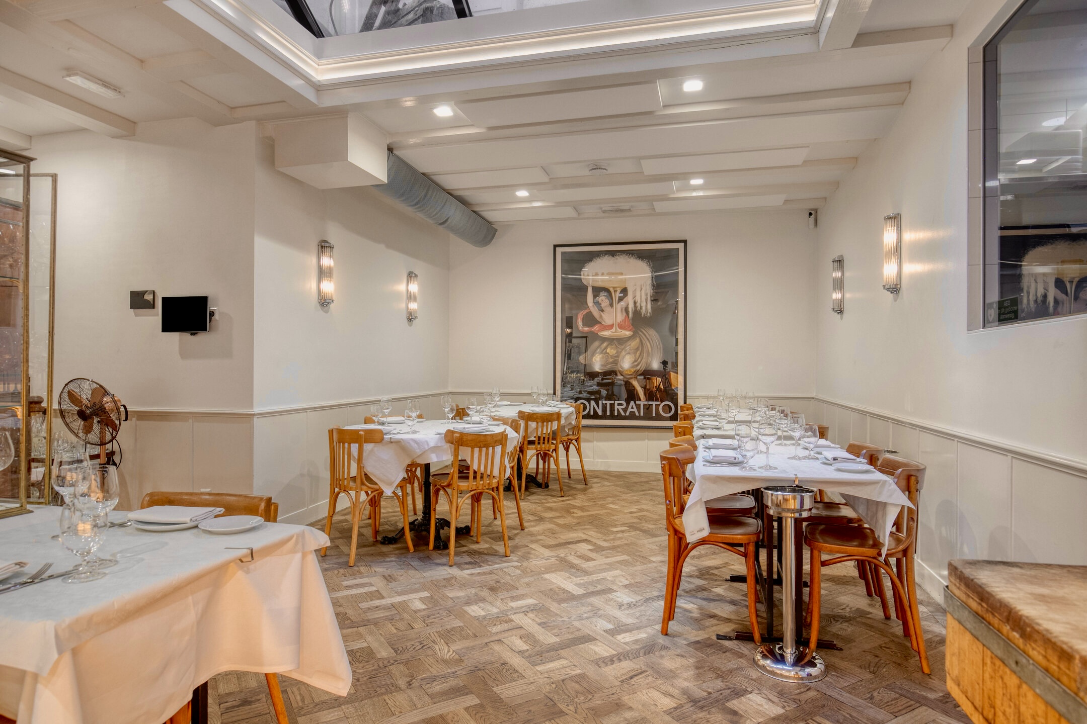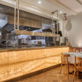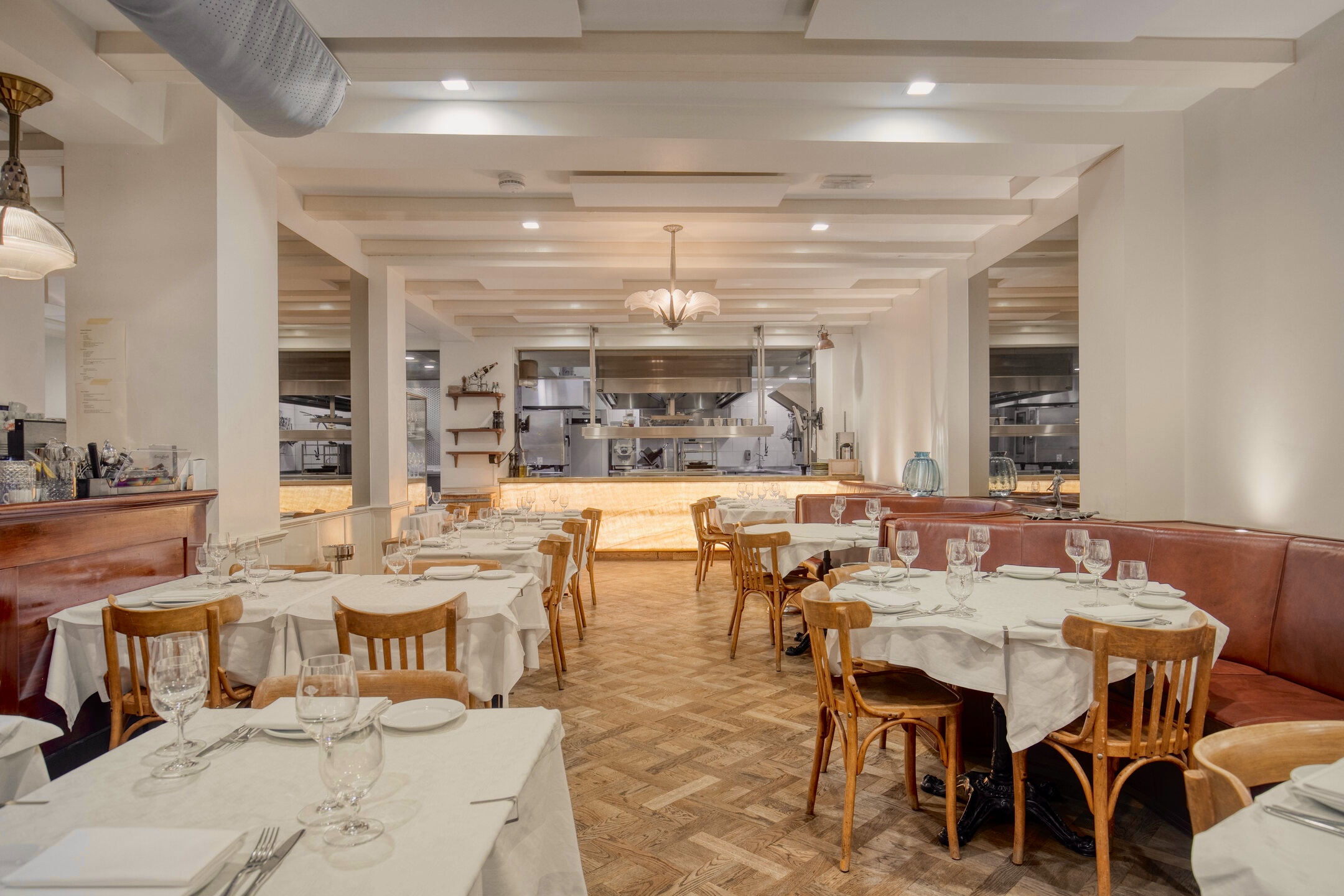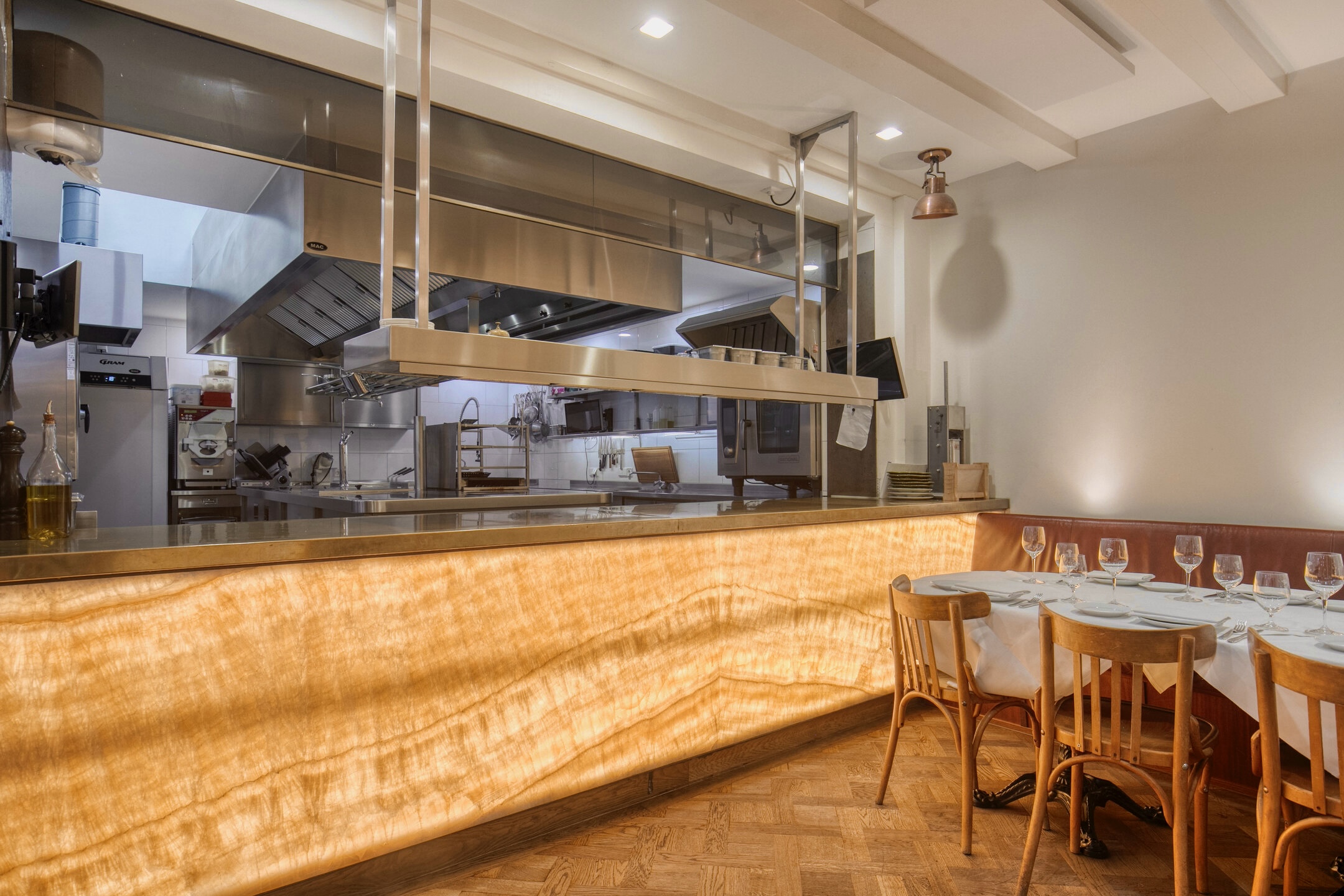 Met een totale oppervlakte van circa 225 m² is de zaak ingedeeld in meerdere zones. De begane grond biedt een sfeervolle verkoopruimte met gezellige tafels voor kleinere gezelschappen en royale ronde zitbanken die perfect zijn voor een uitgebreid diner in goed gezelschap. Achterin bevindt zich de open keuken, gescheiden door een stijlvolle, verlichte bar. Hier kijken gasten mee met de bereiding, wat bijdraagt aan de levendige en dynamische ambiance.