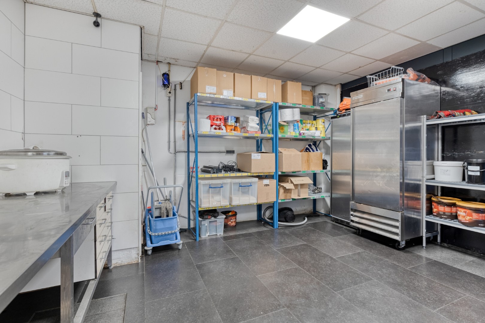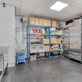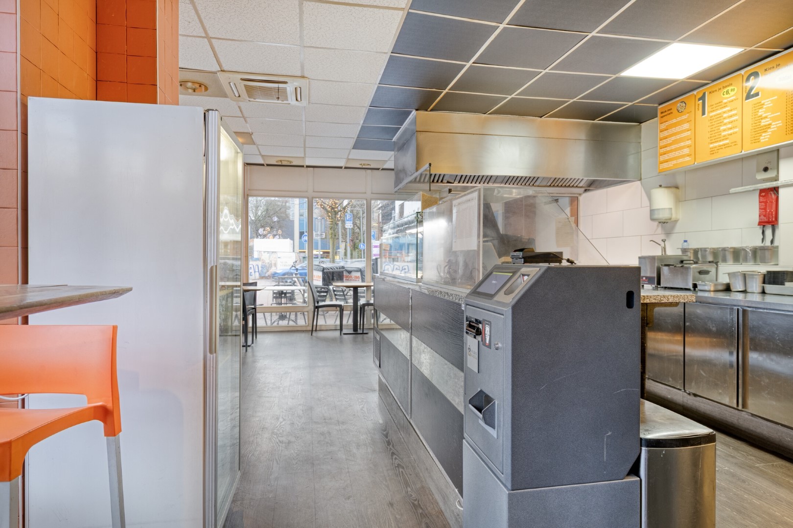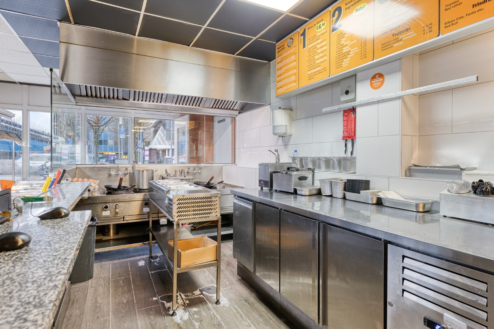 Voorzijde: afhaal- en bestelgedeelte met toonbank en zitplaatsen. Aansluitend een open keuken met professionele wokapparatuur, afzuiging en RVS-werkbladen. Achterzijde: opslag, koel- en vriesfaciliteiten, voorbereidingsruimten en spoelvoorzieningen. De indeling ondersteunt een vlotte exploitatie.