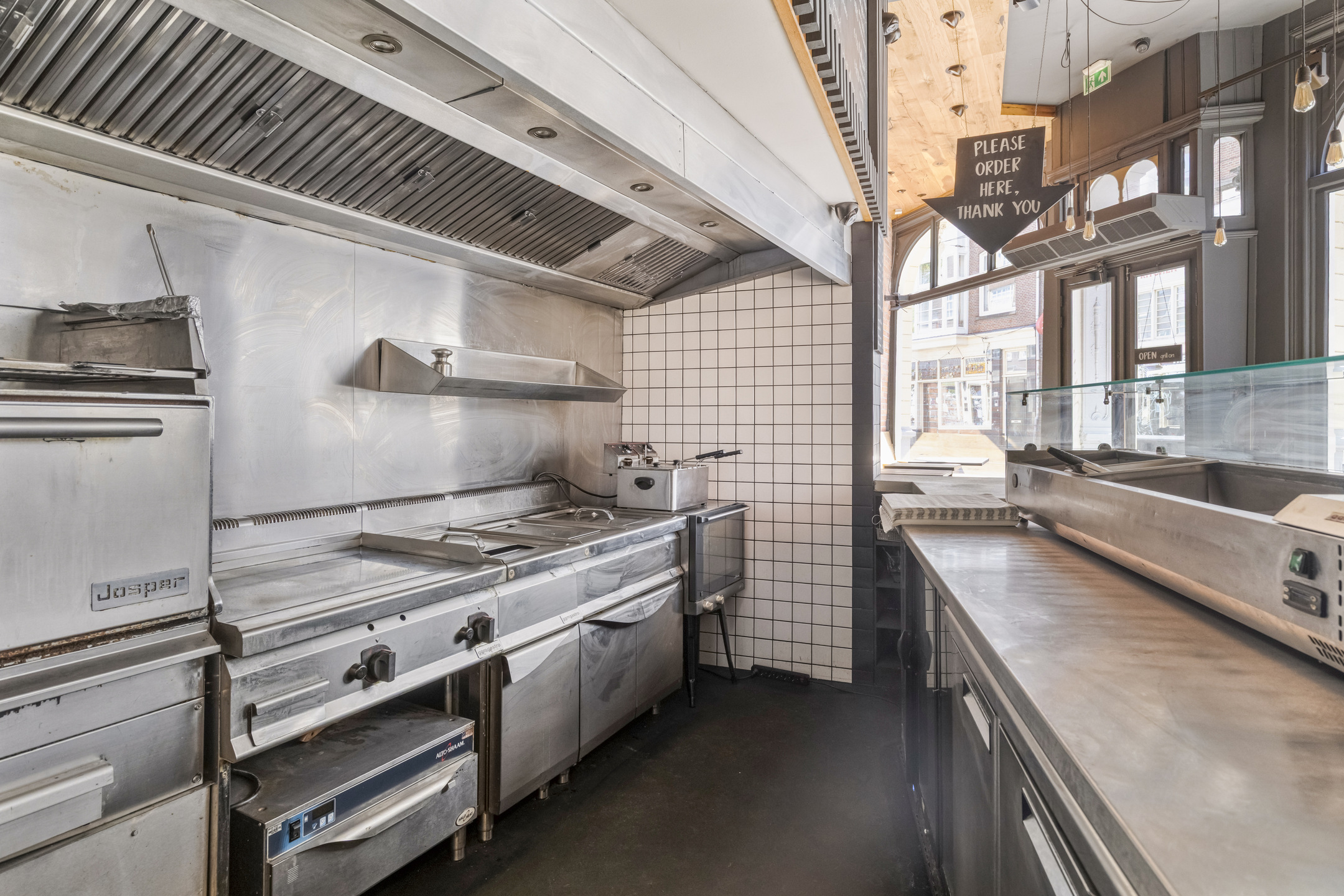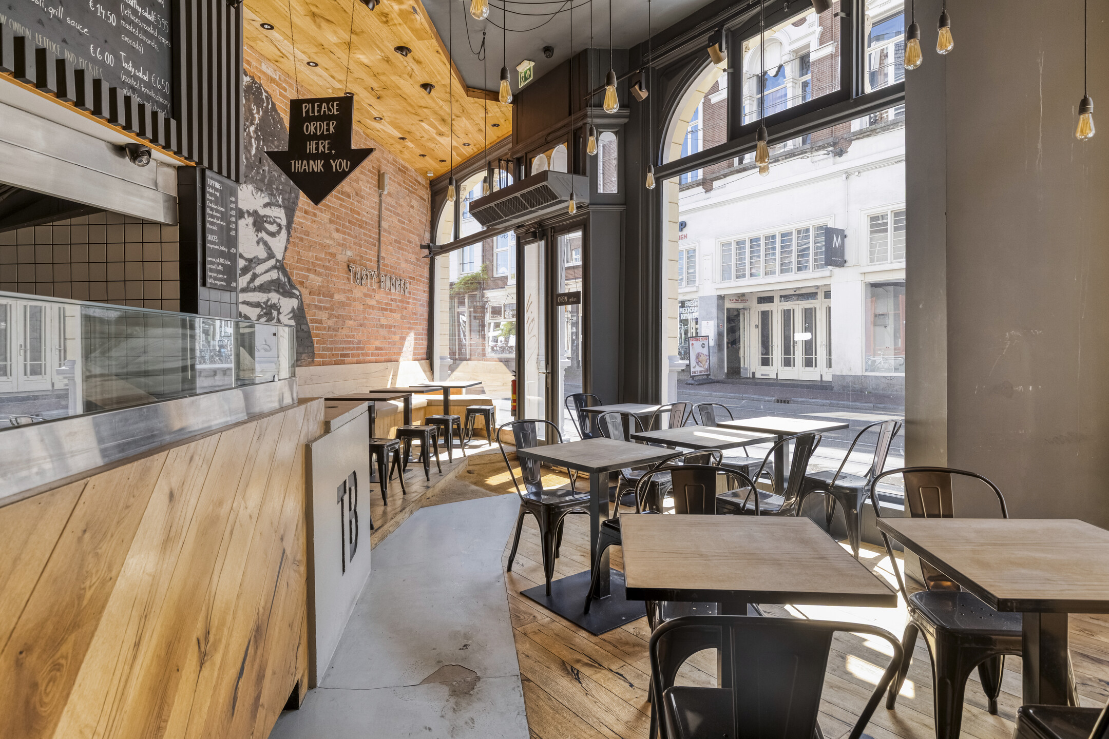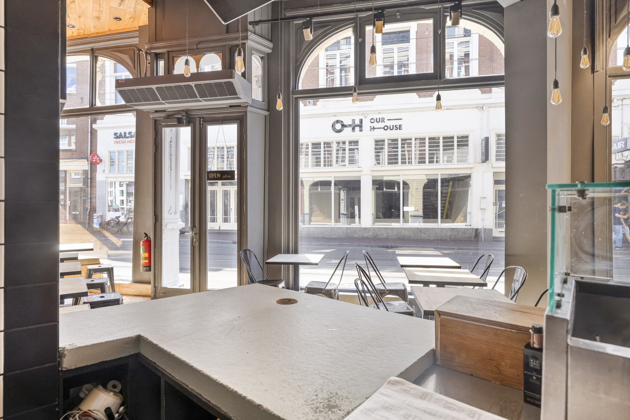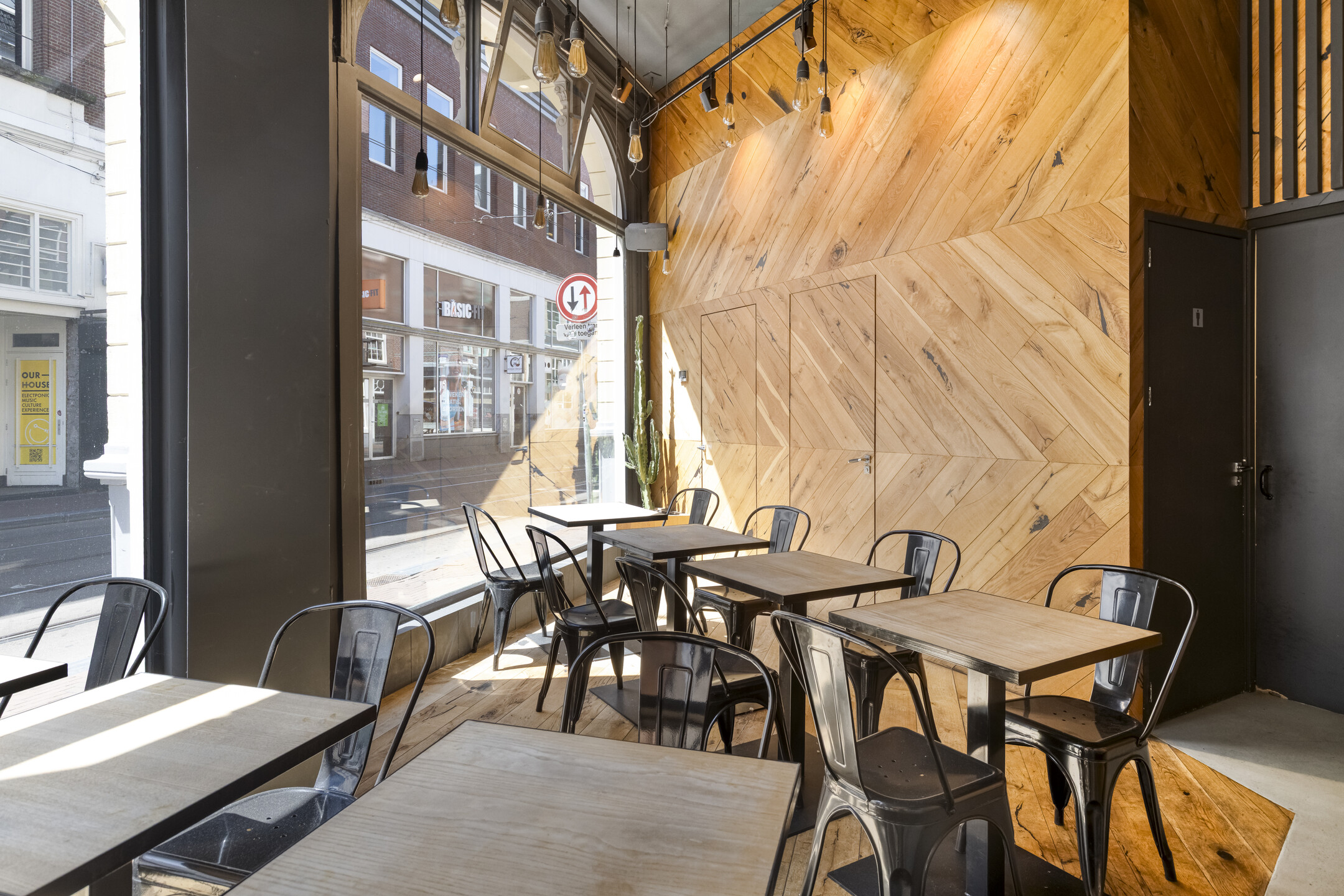 De zaak beschikt over een brede gevel met grote raampartij aan de voorzijde. Eenmaal binnen treft met aan de voorzijde zitplaatsen en daar achter gelegen een open keuken. De entresol is geschikt voor opslag.