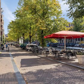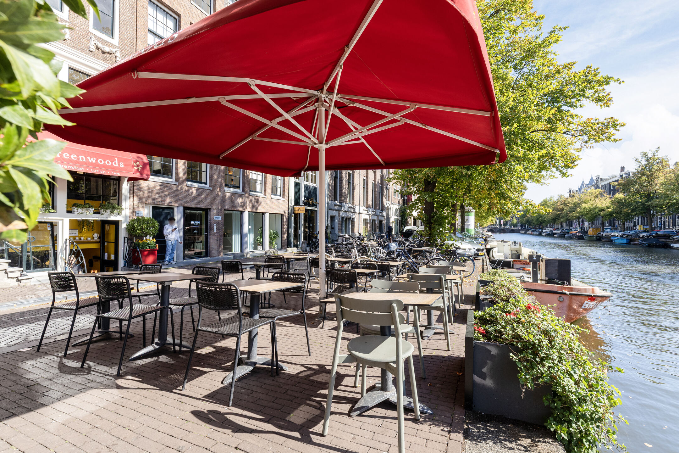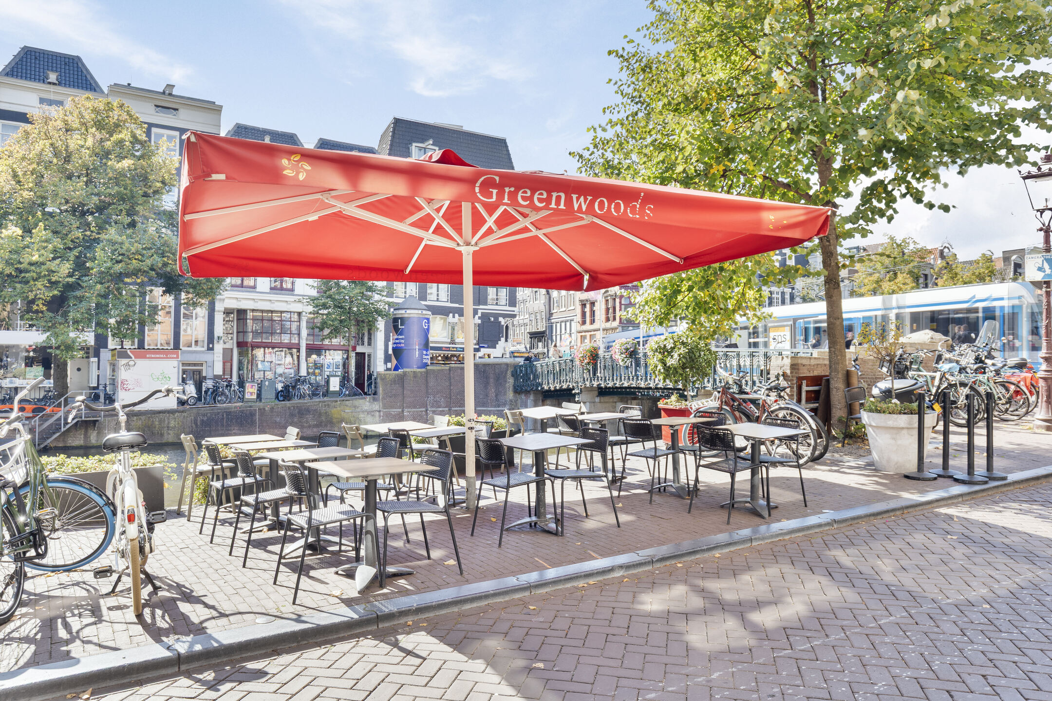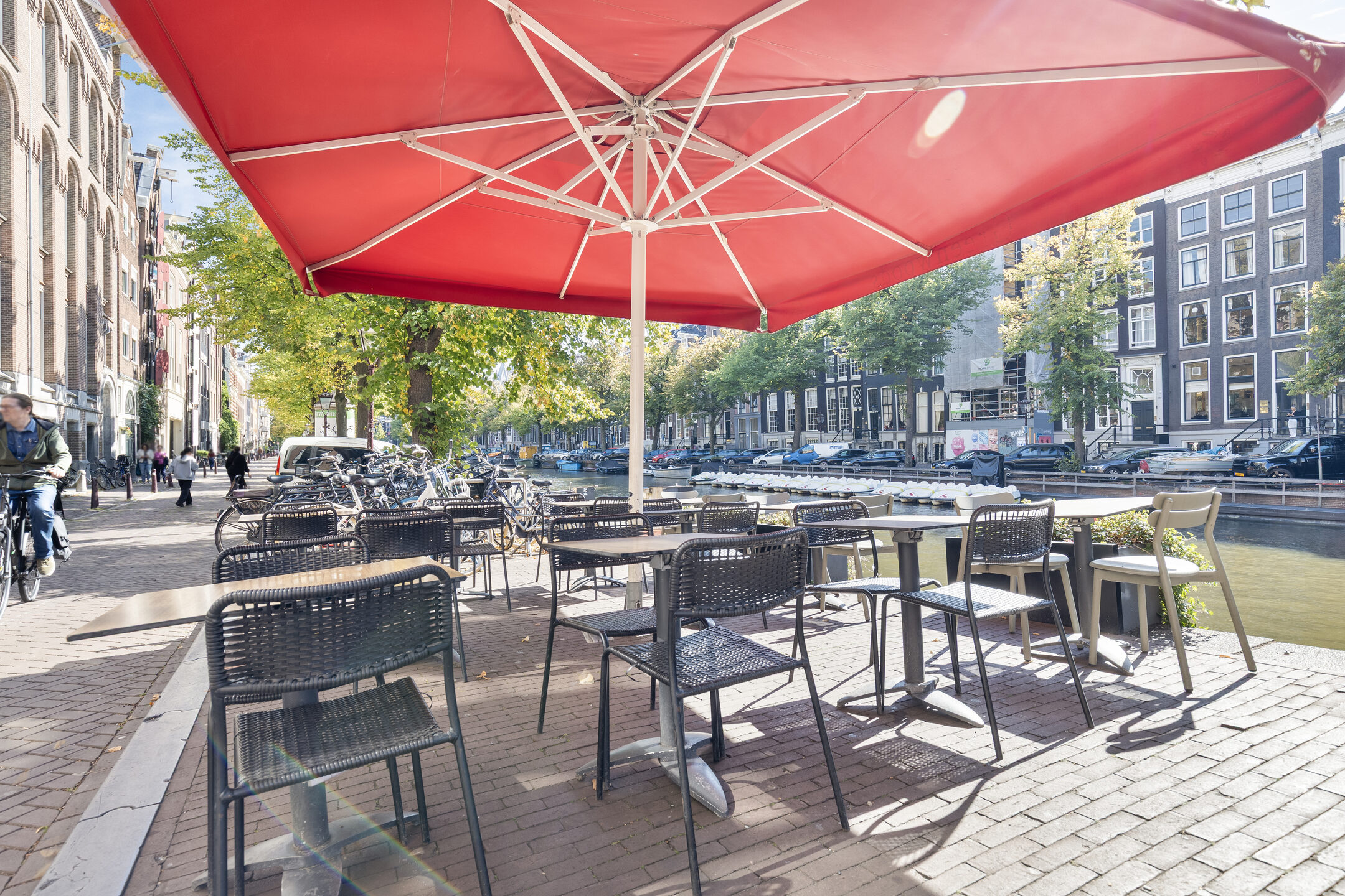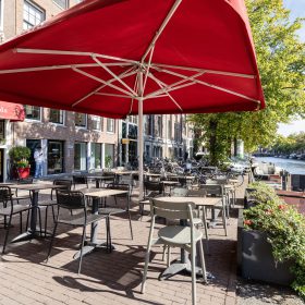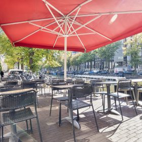 Een groot pluspunt is het ruime terras aan de overzijde van de straat, direct aan het water. Met plek voor circa 25 gasten en sfeervolle parasols, biedt dit terras een intieme setting en profiteert het van de levendigheid rondom de Leidsestraat en de Keizersgracht.