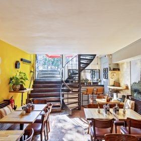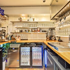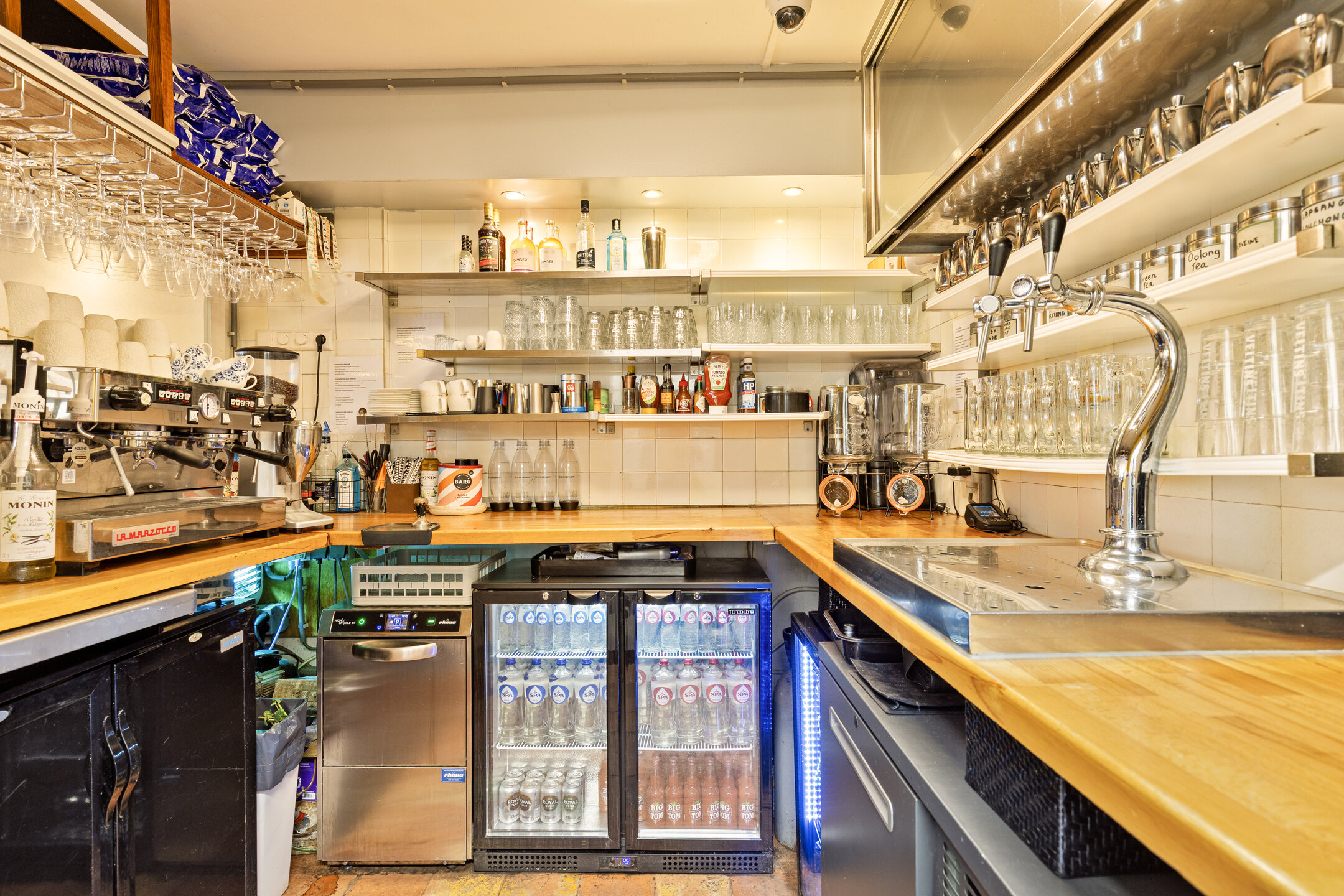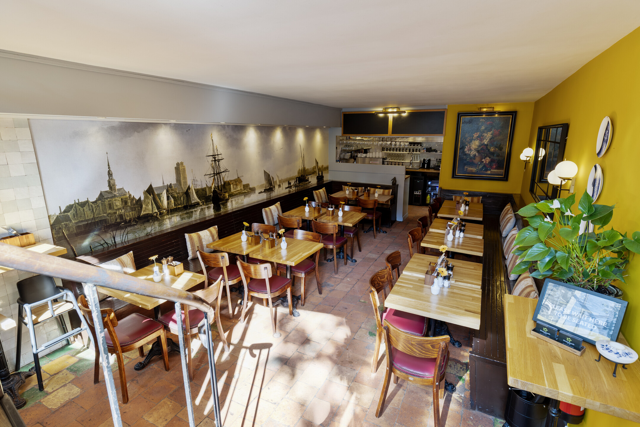 De zaak is ingedeeld als een split-level. In het souterrain is ruimte voor circa 35 gasten, met tafels en comfortabele lange zitbanken langs de muren. Achterin bevindt zich een ruim opgezette bar. Op de bovenverdieping ligt de professioneel uitgeruste keuken en aan de achterzijde een dubbele toiletgroep.