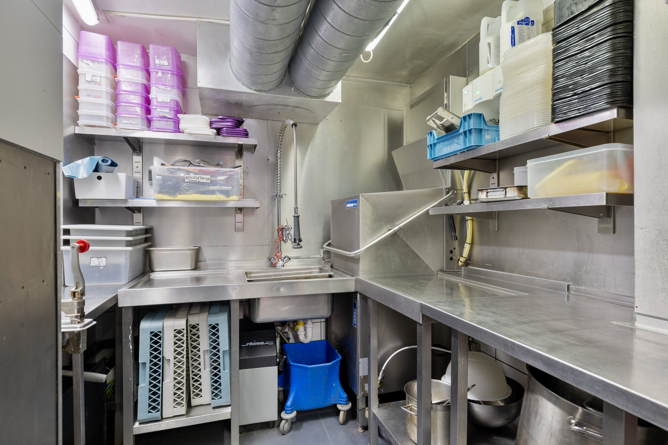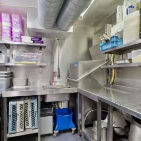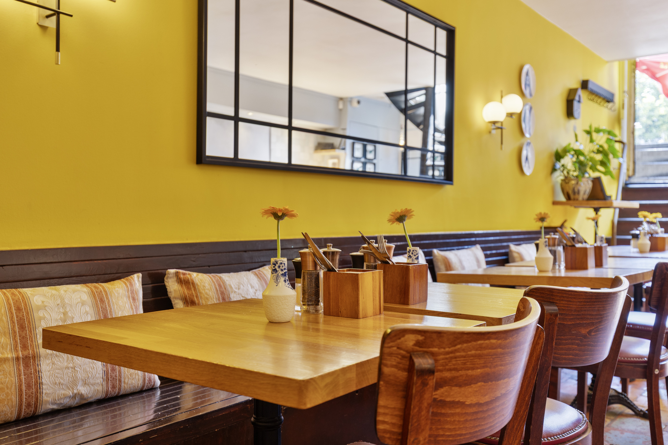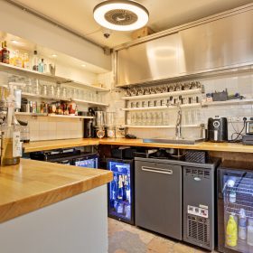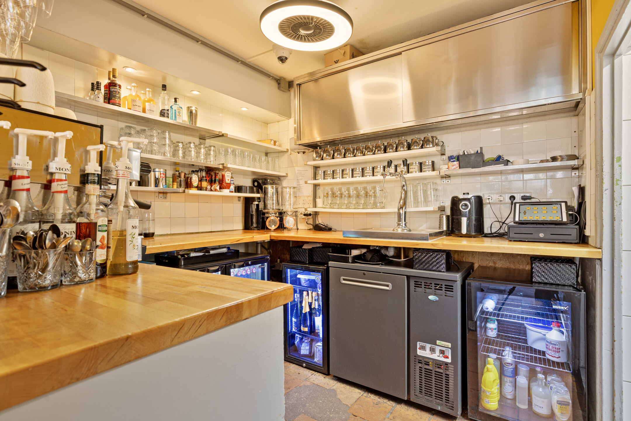 De zaak is ingedeeld als een split-level. In het souterrain is ruimte voor circa 35 gasten, met tafels en comfortabele lange zitbanken langs de muren. Achterin bevindt zich een ruim opgezette bar. Op de bovenverdieping ligt de professioneel uitgeruste keuken en aan de achterzijde een dubbele toiletgroep.