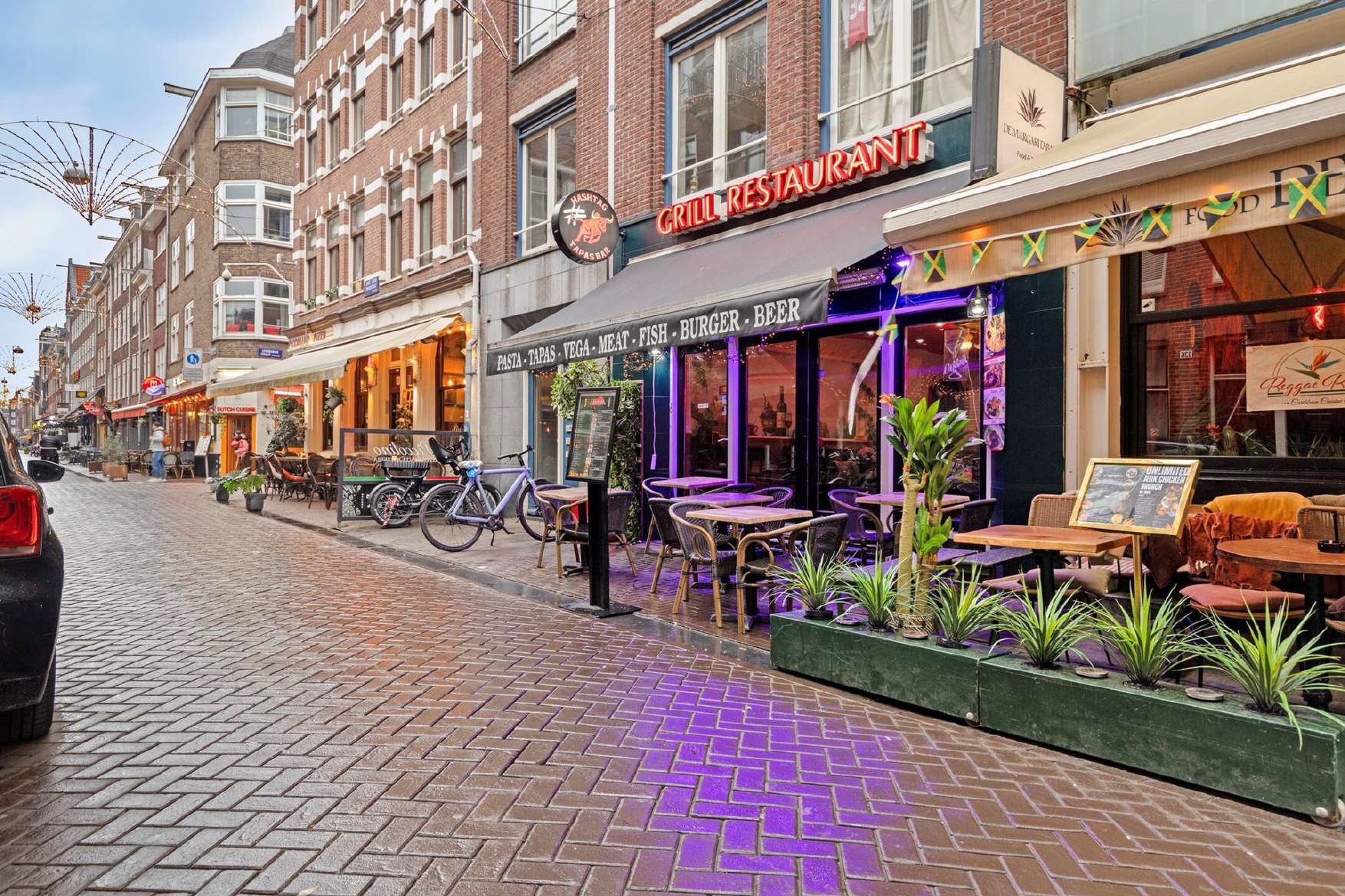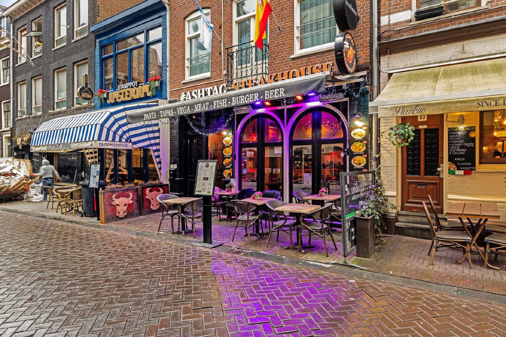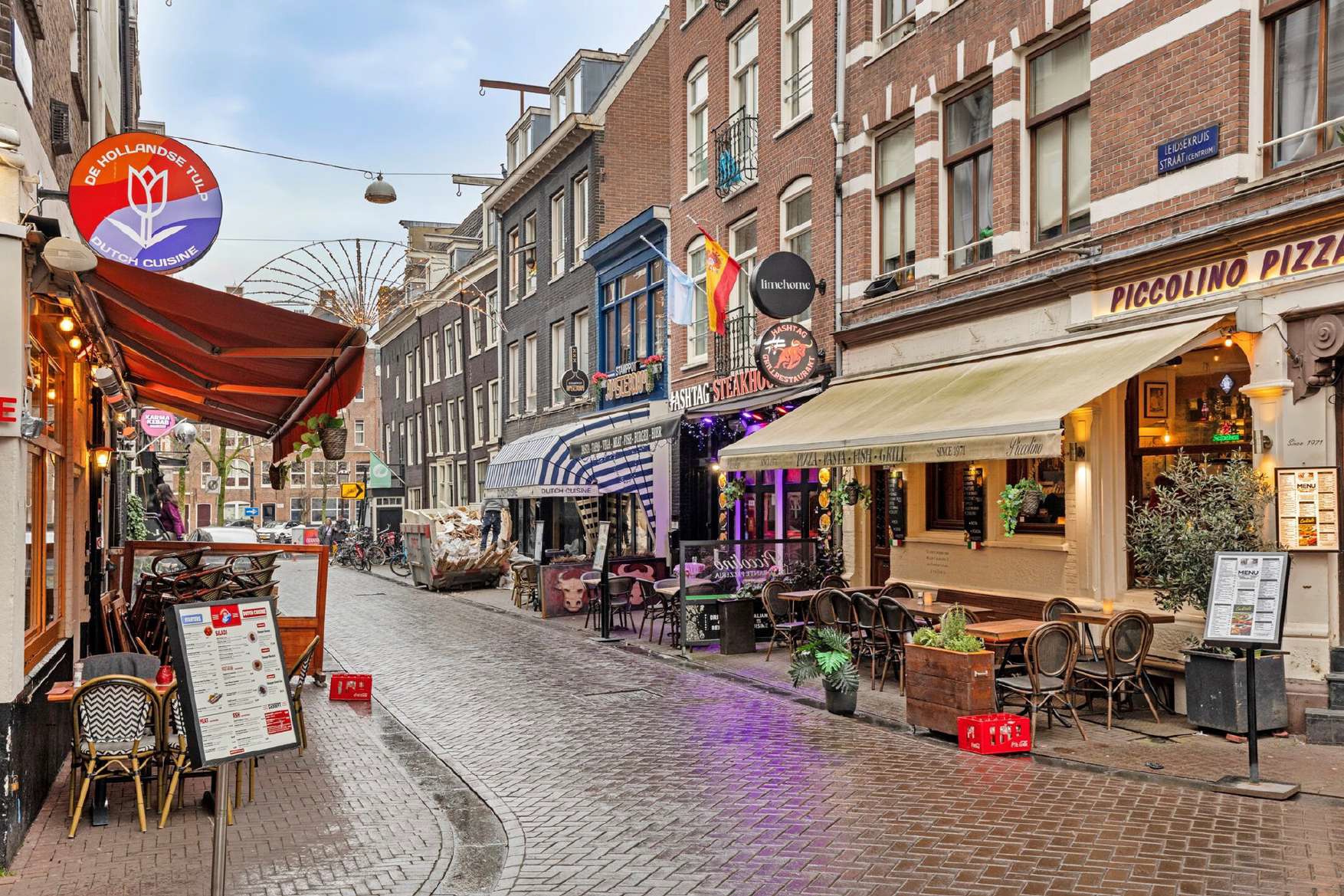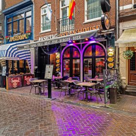Aan de Leidsekruisstraat, op een herkenbare locatie in het centrum van Amsterdam, ligt deze ruime horecazaak met twee ingangen en terrassen aan beide zijden. De ligging in een horecaconcentratiegebied zorgt voor een constante stroom aan bezoekers, variërend van toeristen en dagjesmensen tot uitgaanspubliek dat richting het Leidseplein beweegt. Dankzij de open gevels aan beide straten is de zichtbaarheid van de zaak bijzonder sterk.