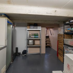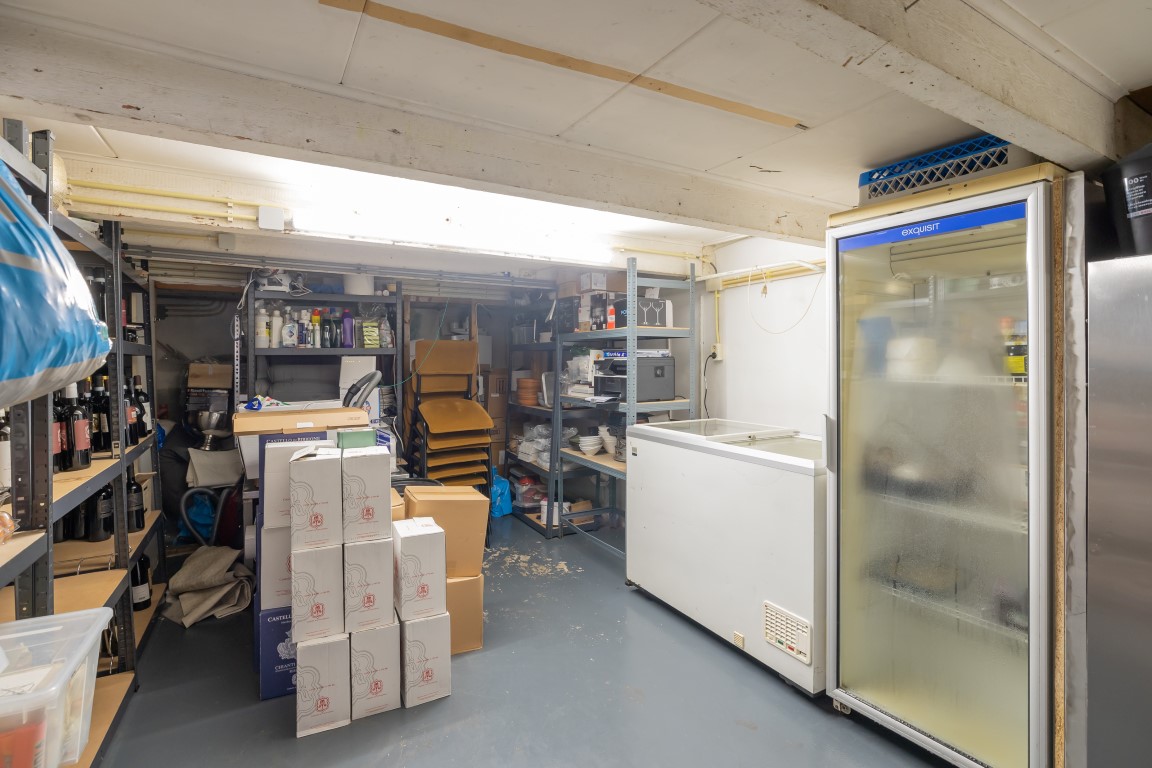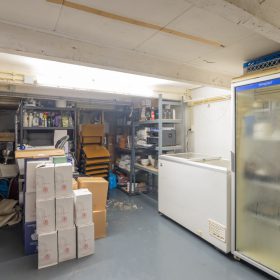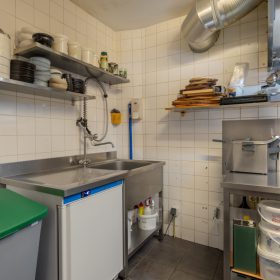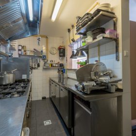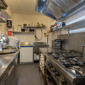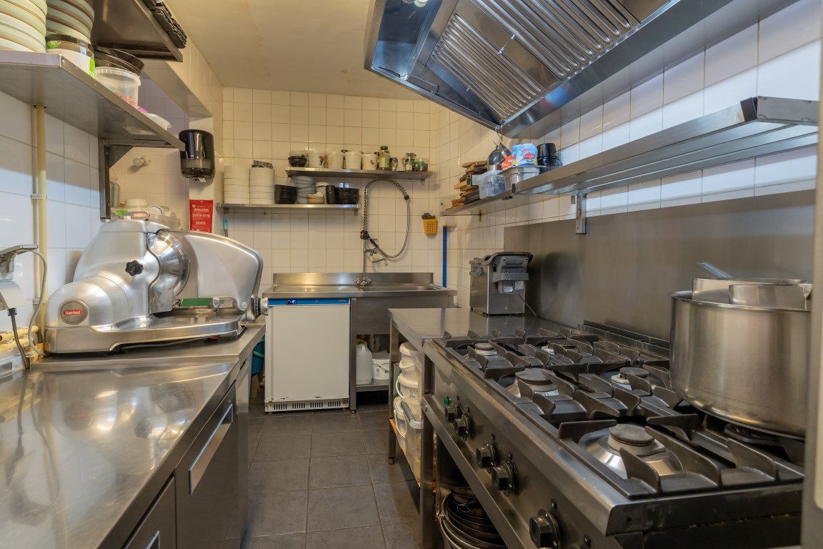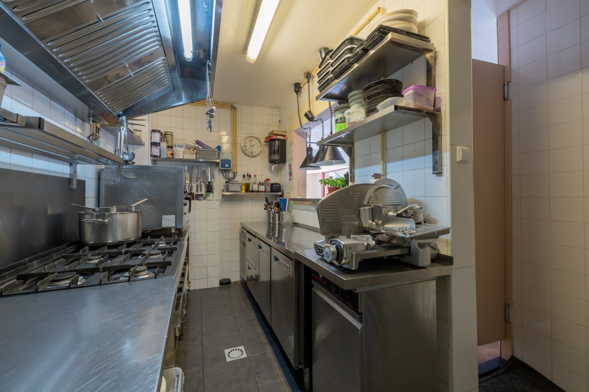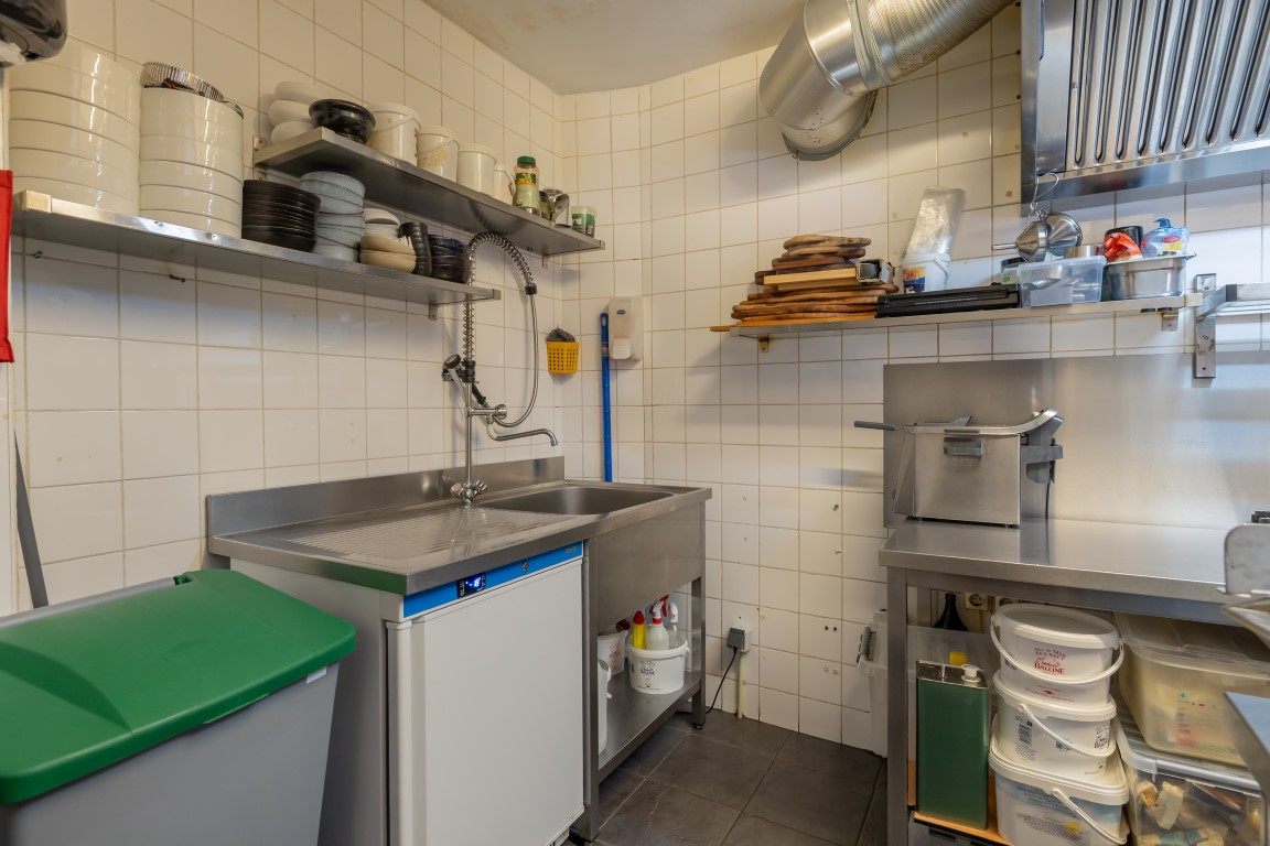De keuken is professioneel ingericht en praktisch opgezet, met daarnaast een ruime opslag die zorgt voor een overzichtelijke bedrijfsvoering. Aan de straatzijde bevindt zich een klein terras met zitbanken, wat bijdraagt aan de zichtbaarheid en het contact met voorbijgangers.