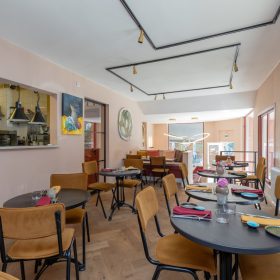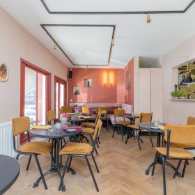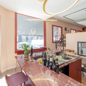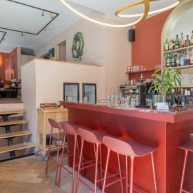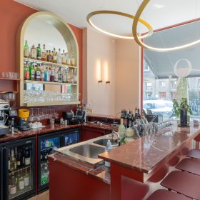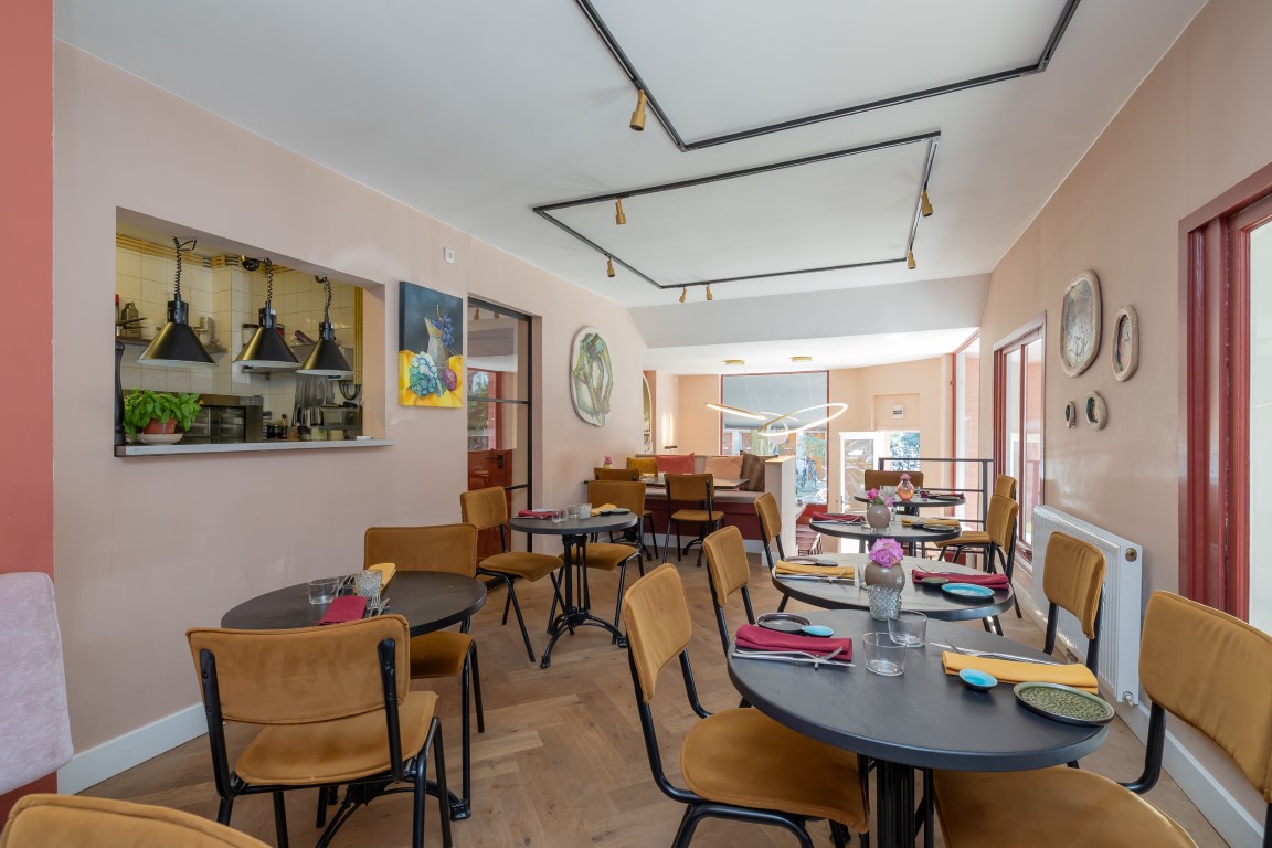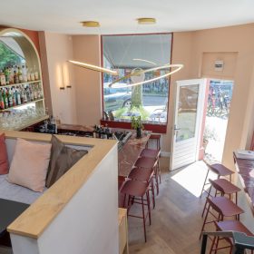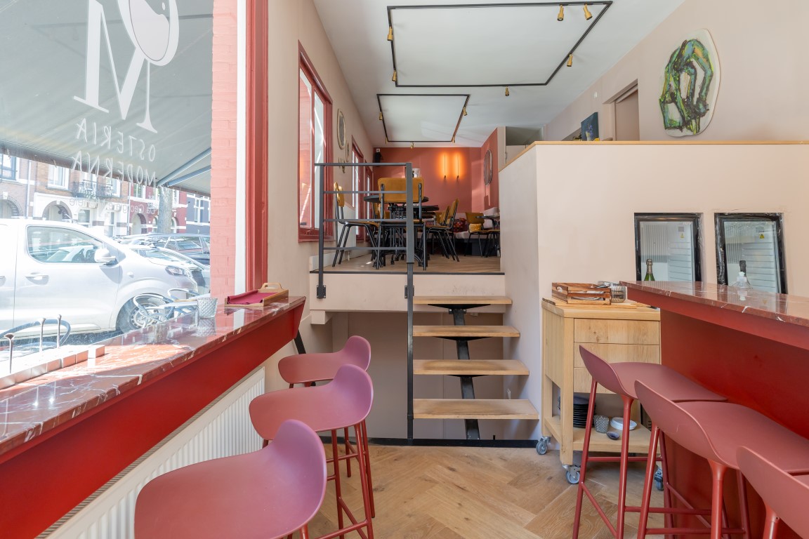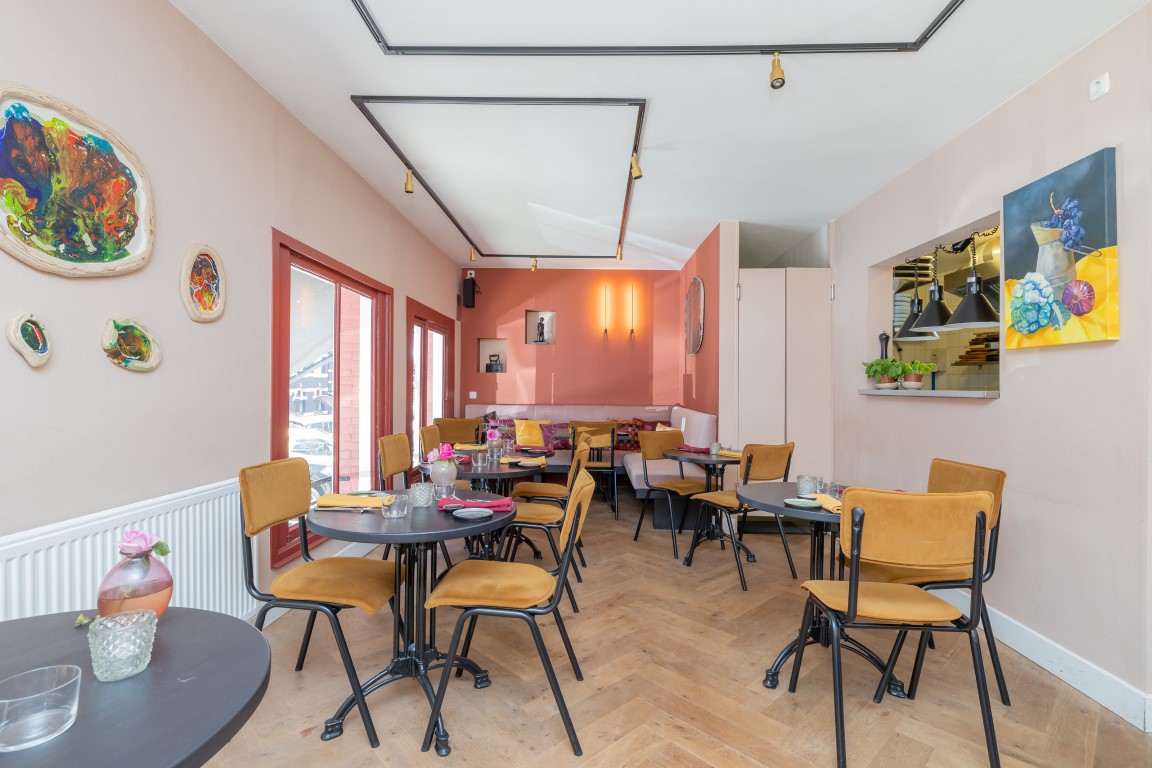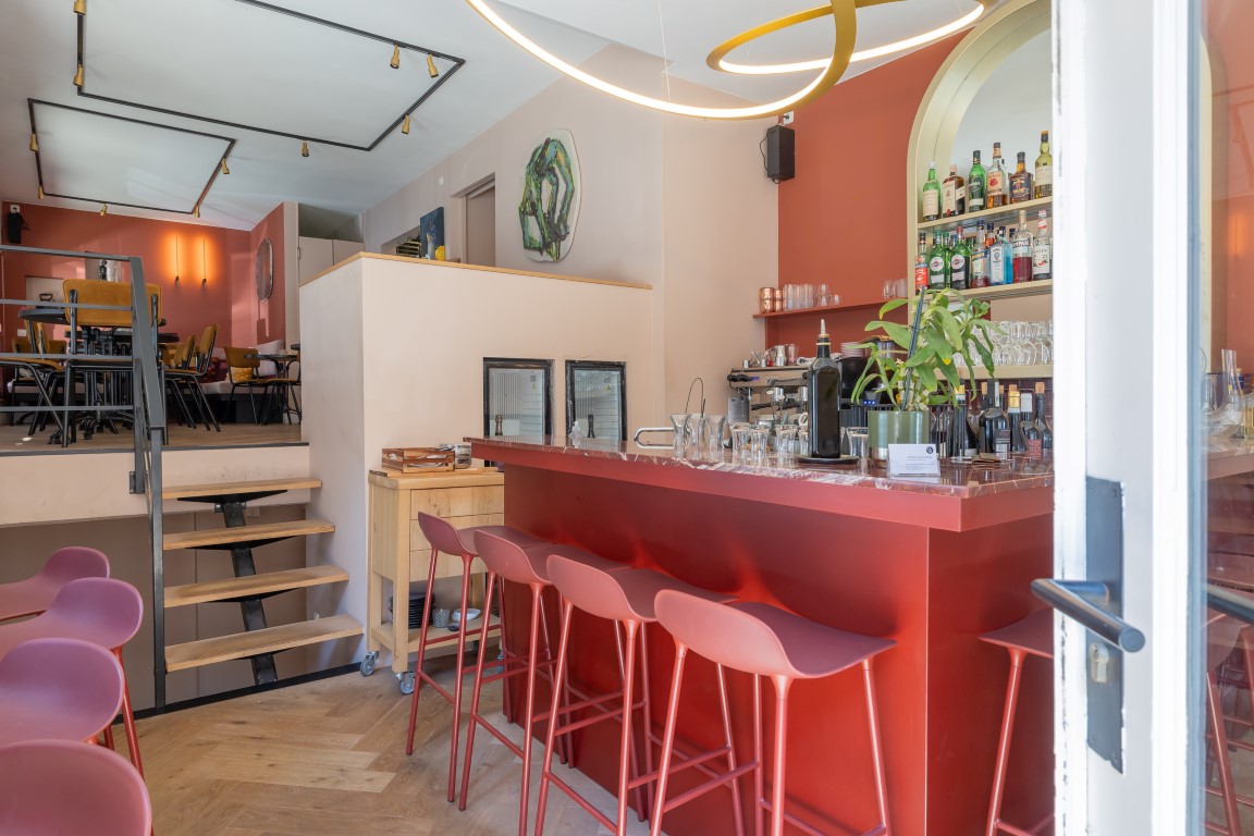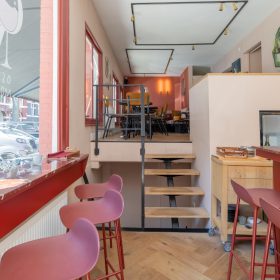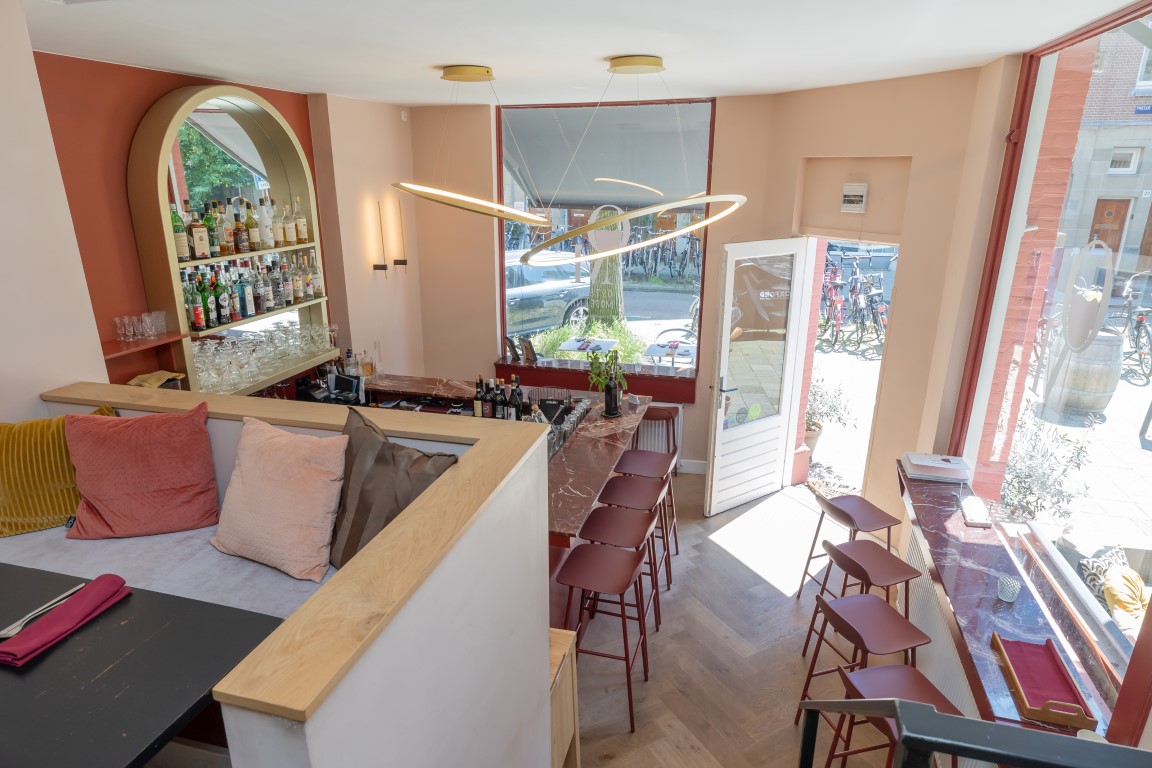 Binnen zijn circa 45 zitplaatsen aanwezig, verdeeld over de begane grond en een tussenverdieping die uitkijkt op de bar. Deze verhoogde ruimte geeft de zaak een speels karakter en biedt extra mogelijkheden voor zitplekken of een meer besloten opstelling.