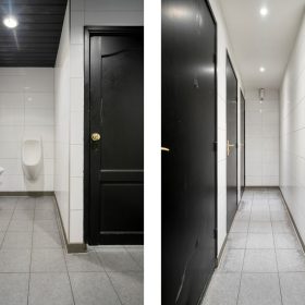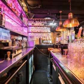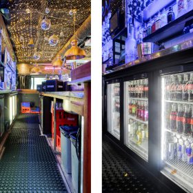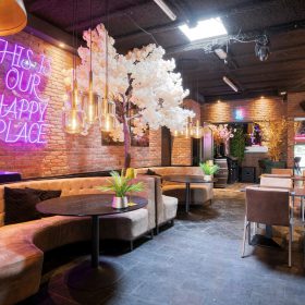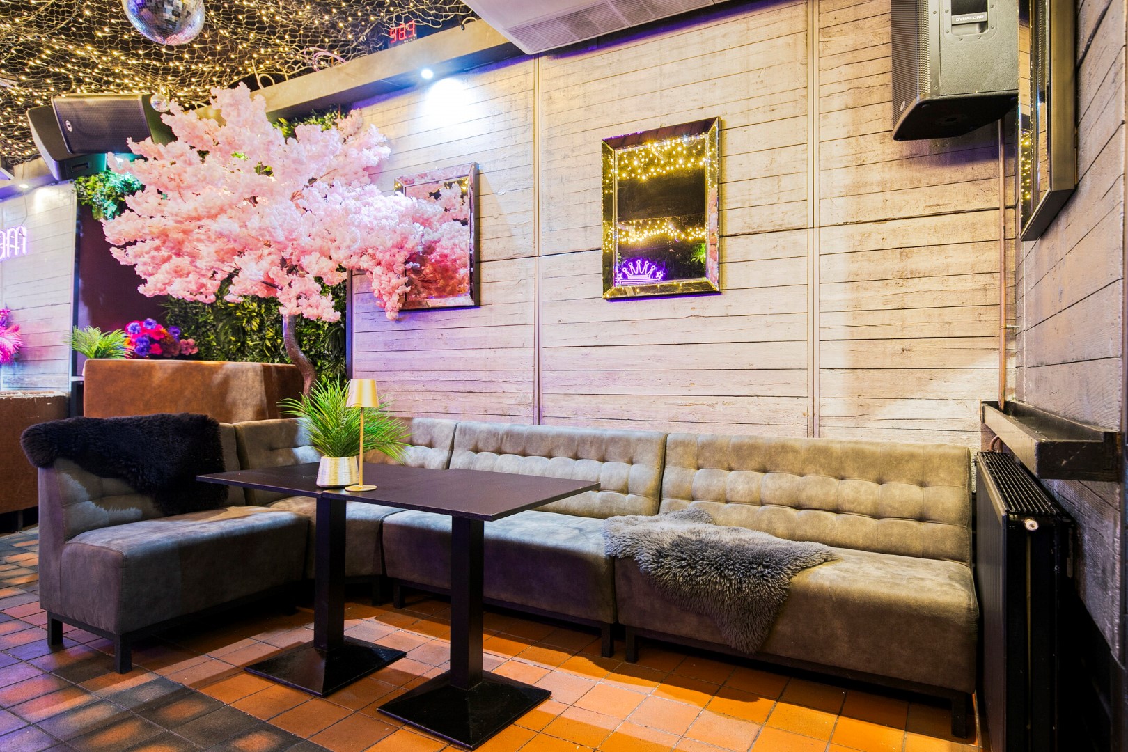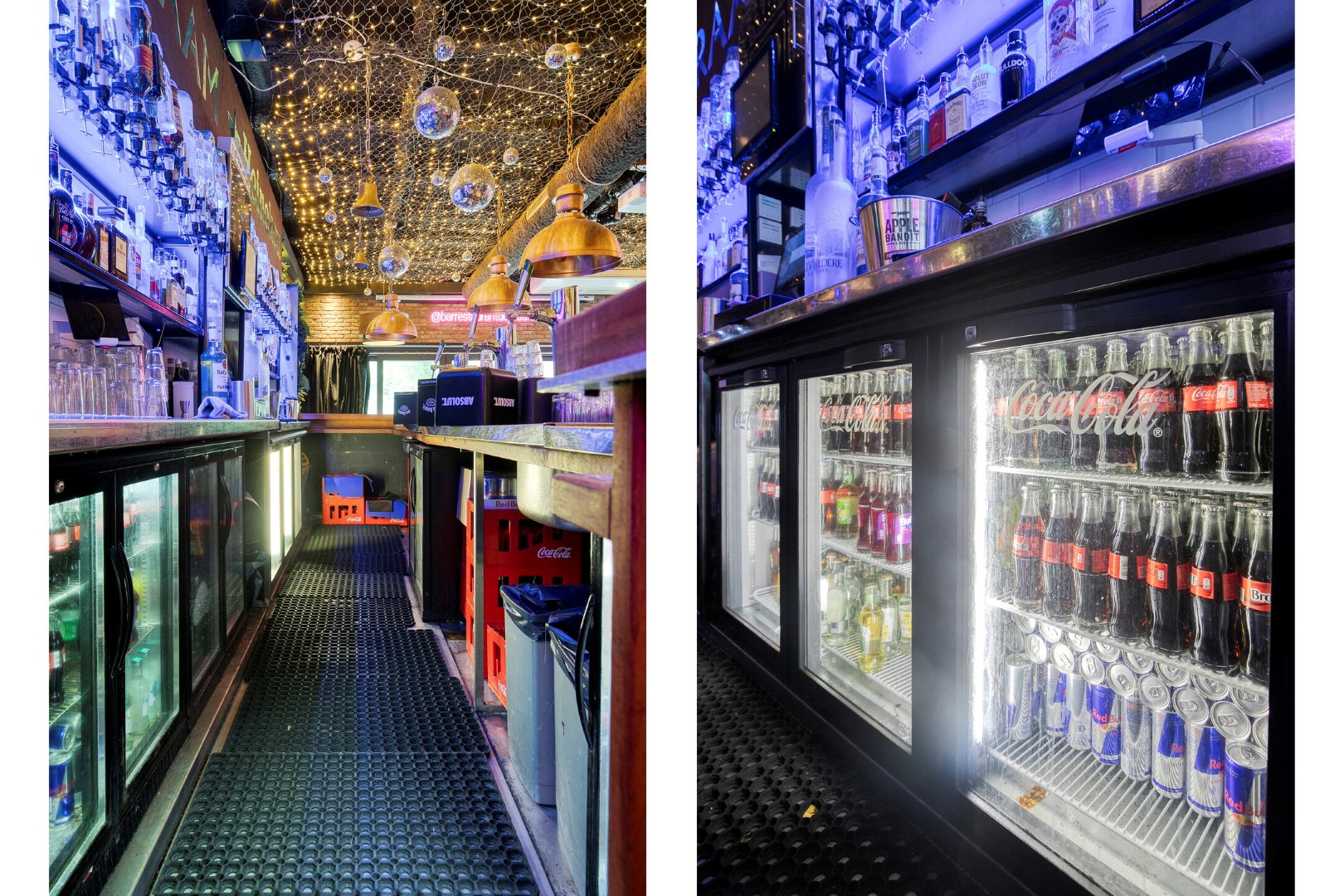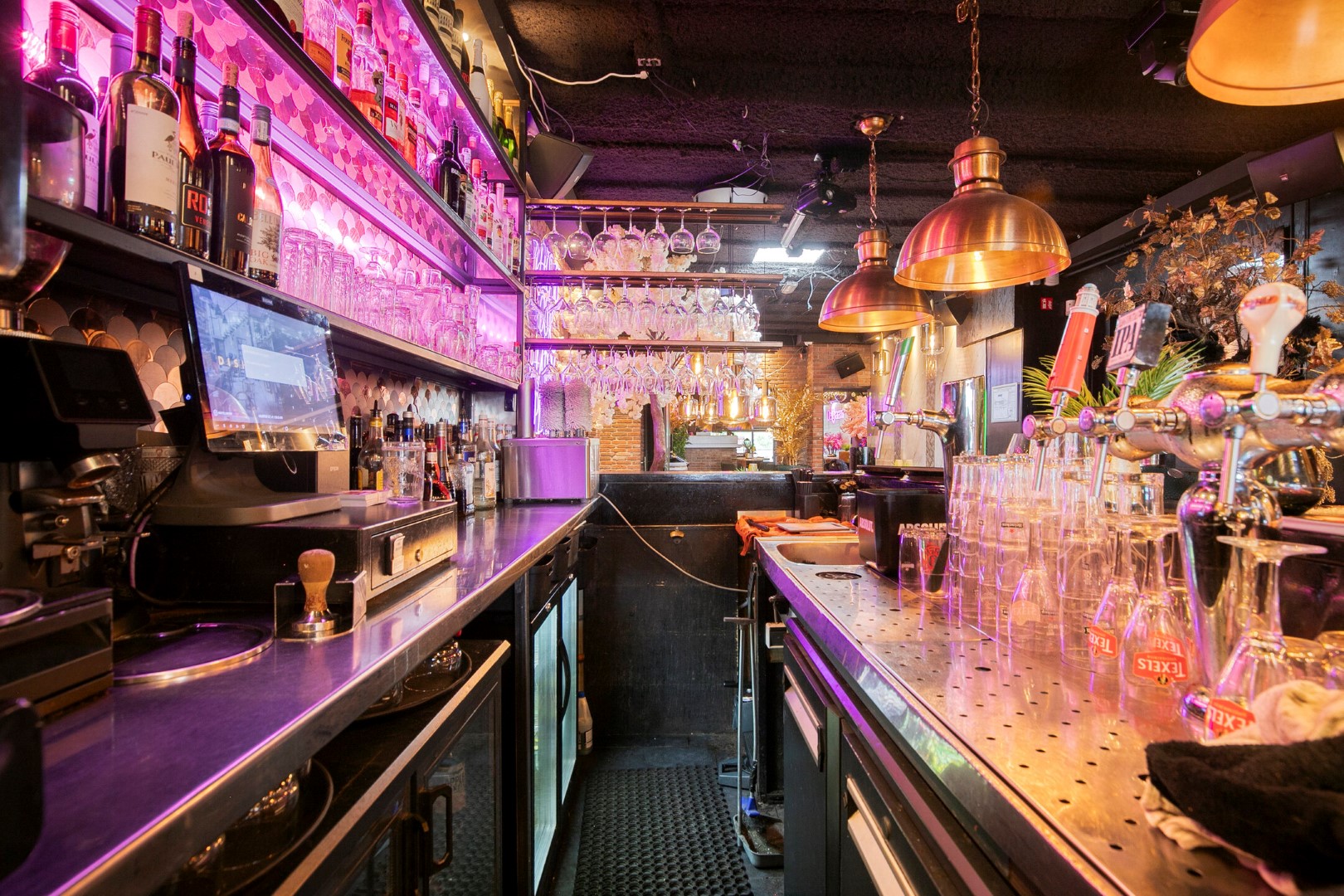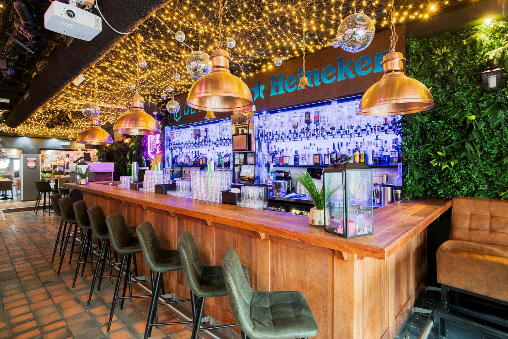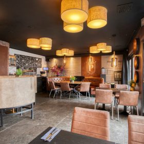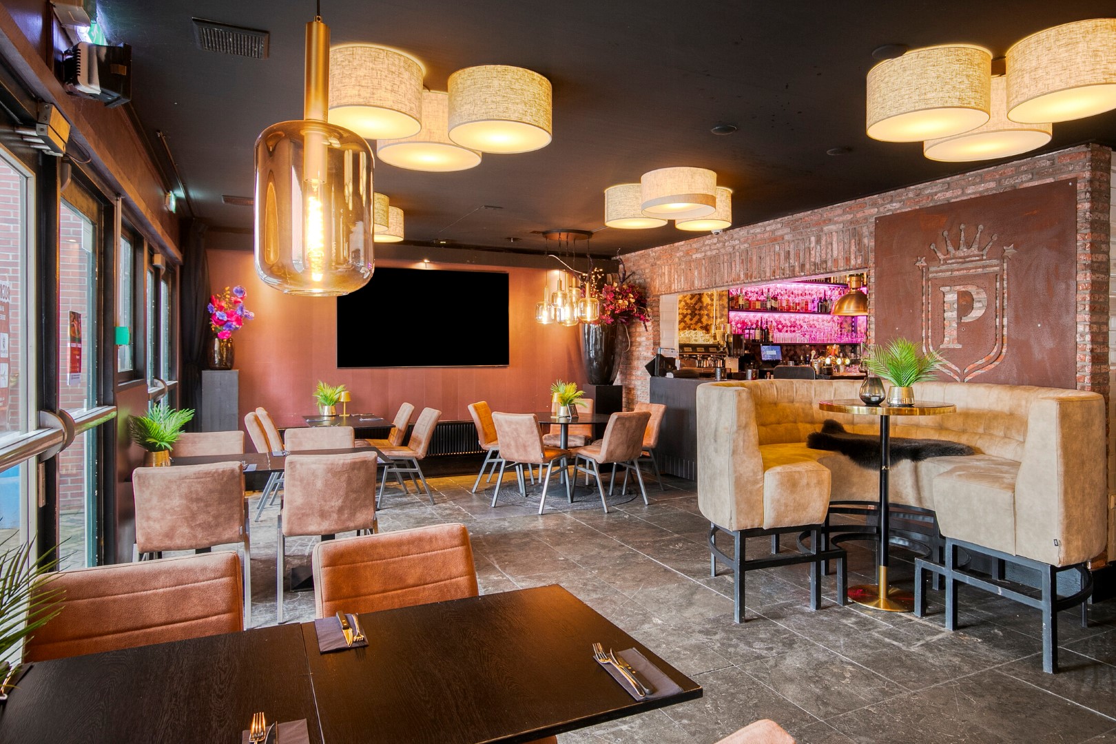 Bij binnenkomst betreedt men de verkoopruimte, die warm en modern is ingericht. De zaak beschikt over diverse zitgelegenheden, waaronder comfortabele banken, gezellige tafels en zitplekken aan de bar. Dankzij de grote ramen aan de voorzijde valt er veel natuurlijk licht binnen, wat zorgt voor een open en uitnodigende uitstraling. Vanuit de zaak heeft men bovendien uitzicht op het terras aan de achterzijde. De sfeervolle bar is volledig uitgerust met alle benodigde apparatuur, en achterin bevindt zich de professioneel ingerichte keuken met ruime werkbanken. Verder beschikt de zaak over een dubbele toiletgroep en voldoende opslagruimte.