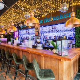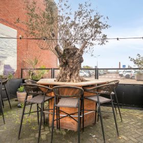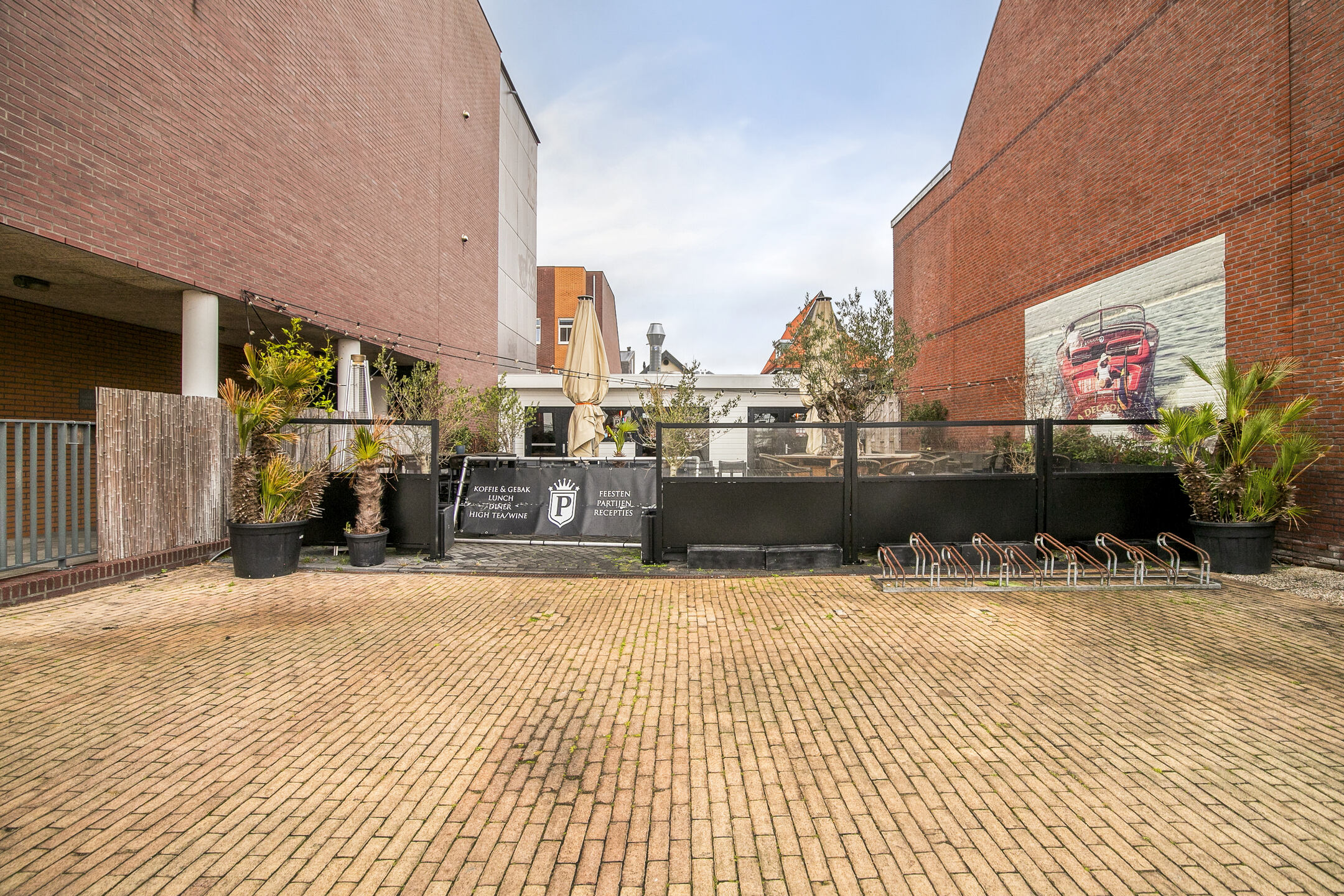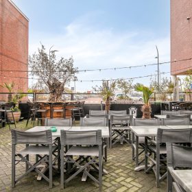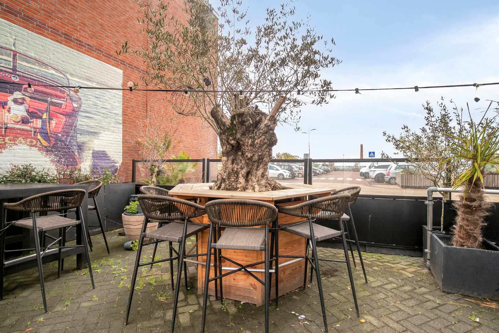 Aan de achterzijde ligt het ruime terras, met zitplaatsen voor circa 40 gasten. Het terras biedt vrij uitzicht op de straat en is een heerlijke plek om in de zon te zitten. Door de rustige ligging en de prettige indeling is het de ideale plek voor gasten.