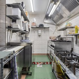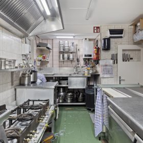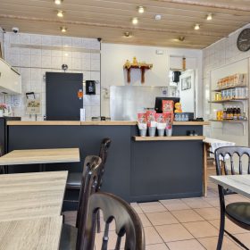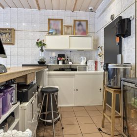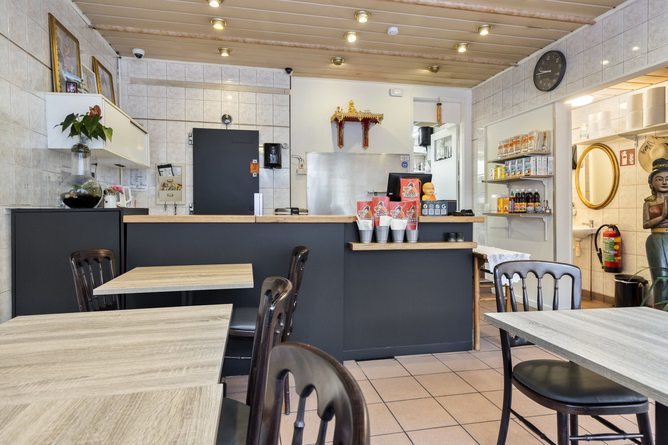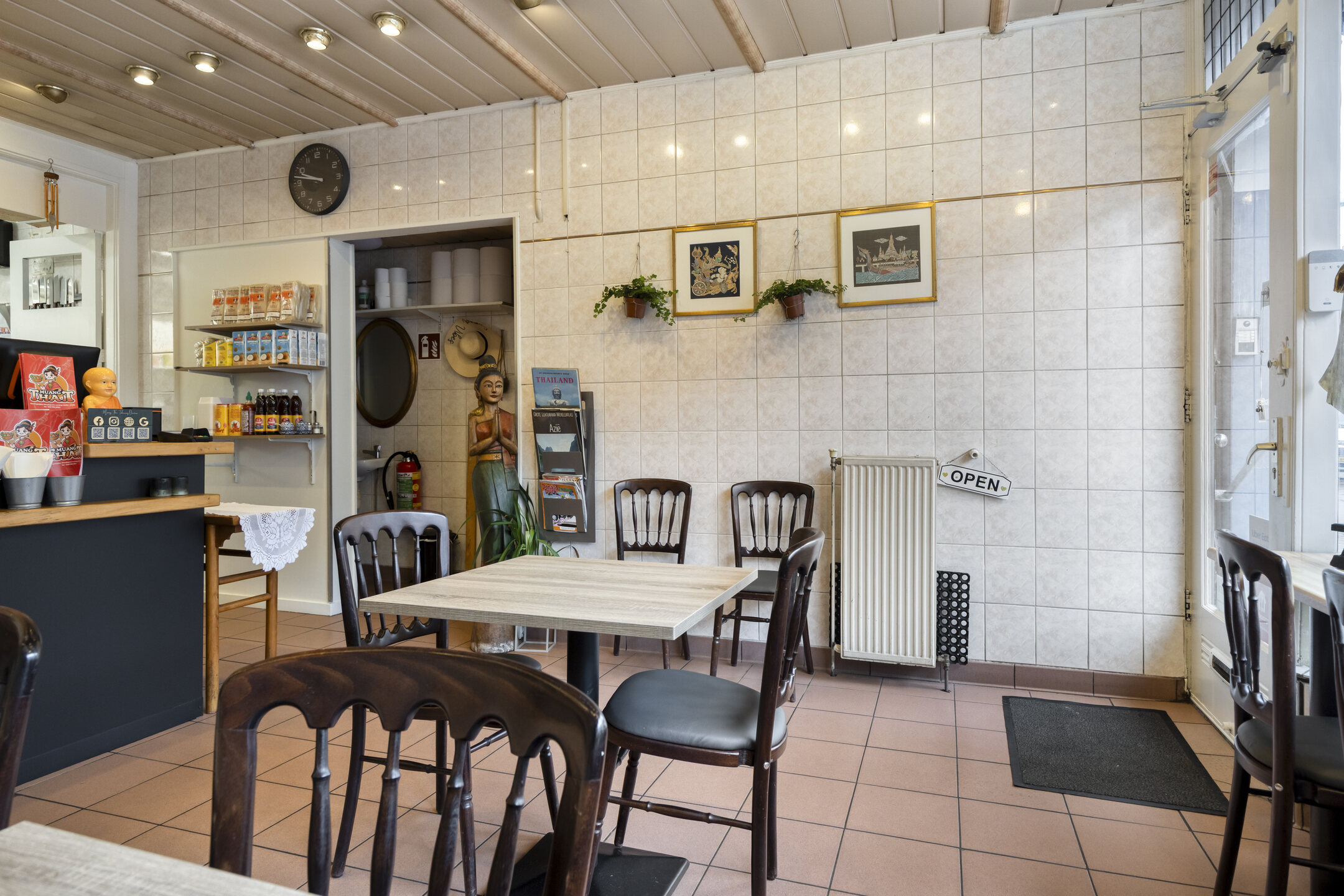De zaak is sfeervol ingericht. Achterin bevindt zich een compacte maar efficiënte keuken. Aan de achterzijde van het pand ligt een kleine binnenplaats, momenteel in gebruik als opslagruimte. Daarnaast is er een kelder die extra opslagmogelijkheden biedt.