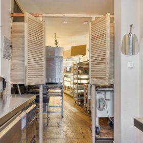 Dankzij de grote raampartij aan de voorzijde is de bakkerij goed zichtbaar vanaf de straat en straalt de warme, uitnodigende inrichting direct gastvrijheid uit.