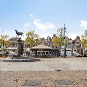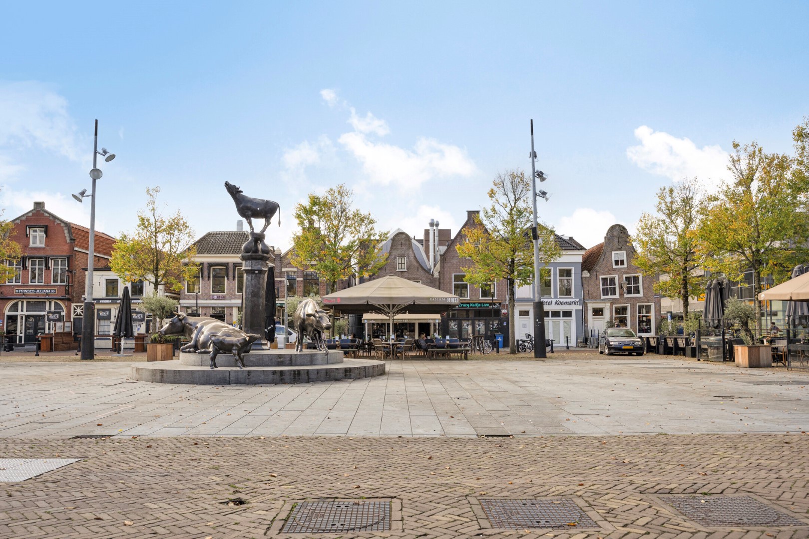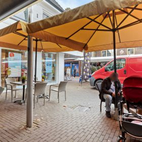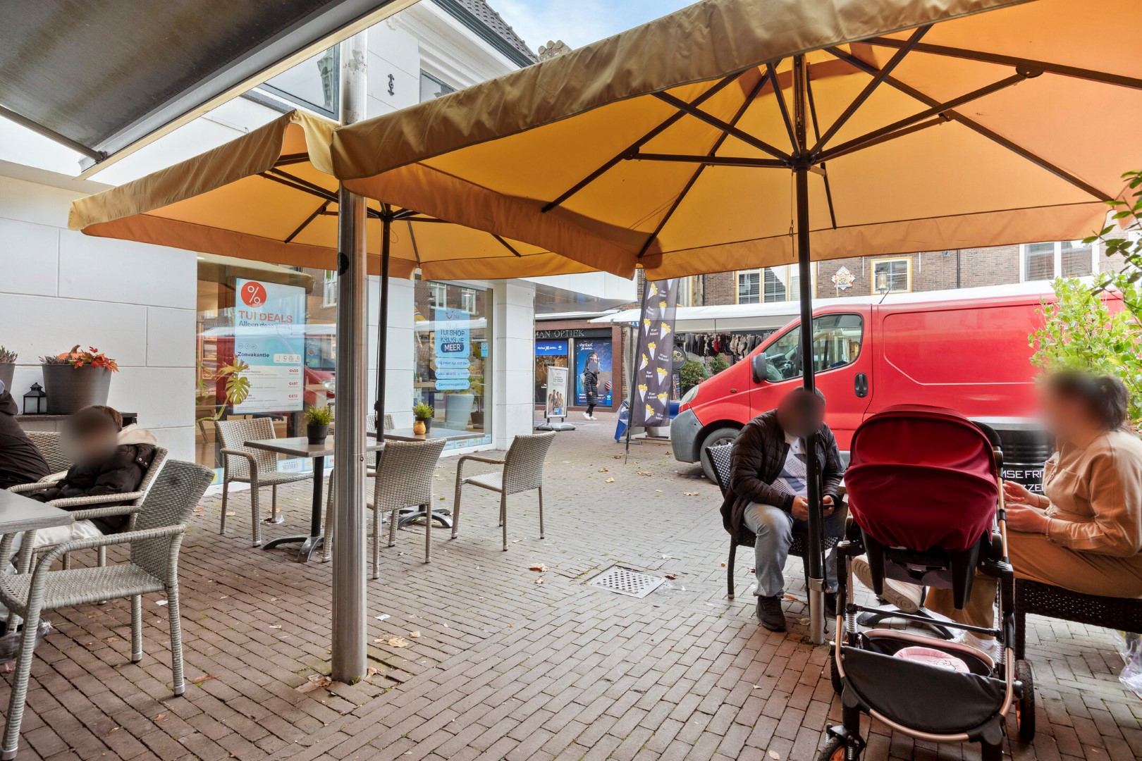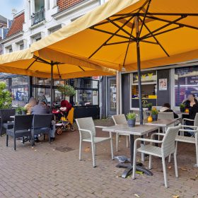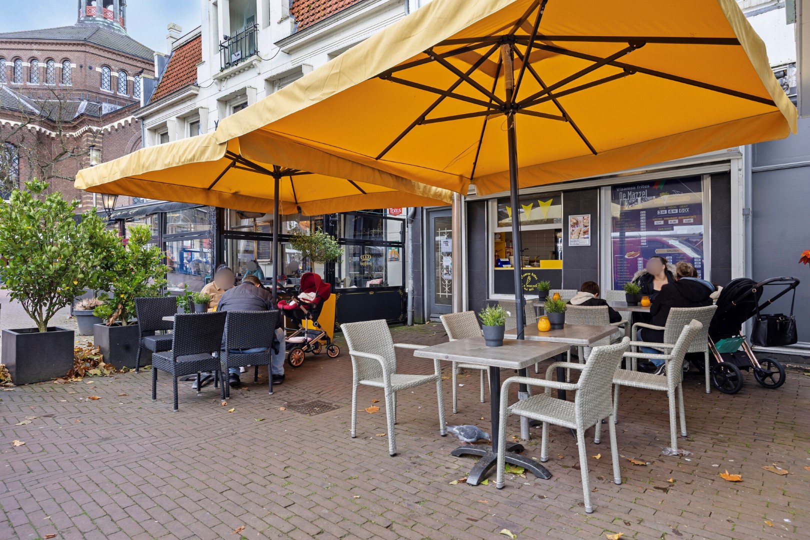 Aan de voorzijde bevindt zich een modern en uitnodigend terras, perfect gepositioneerd om gasten te laten genieten van het gezellige straatbeeld en de levendige sfeer van het plein.