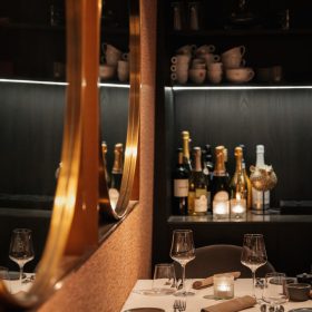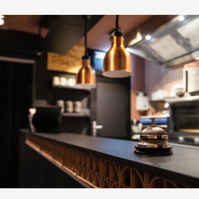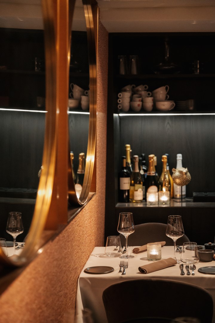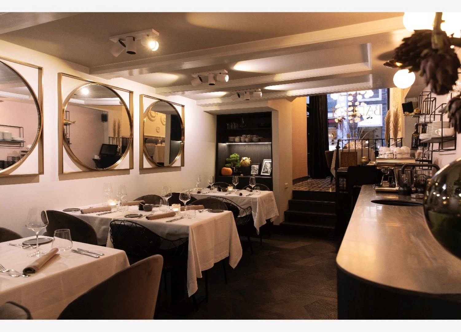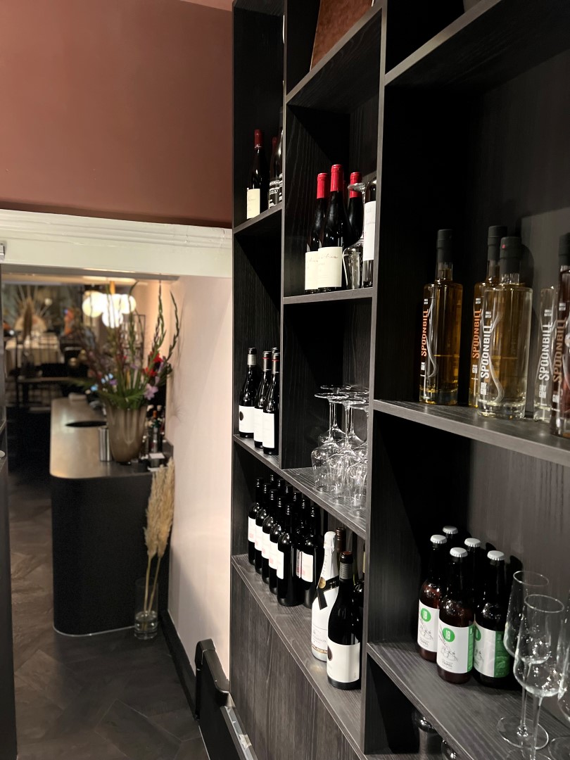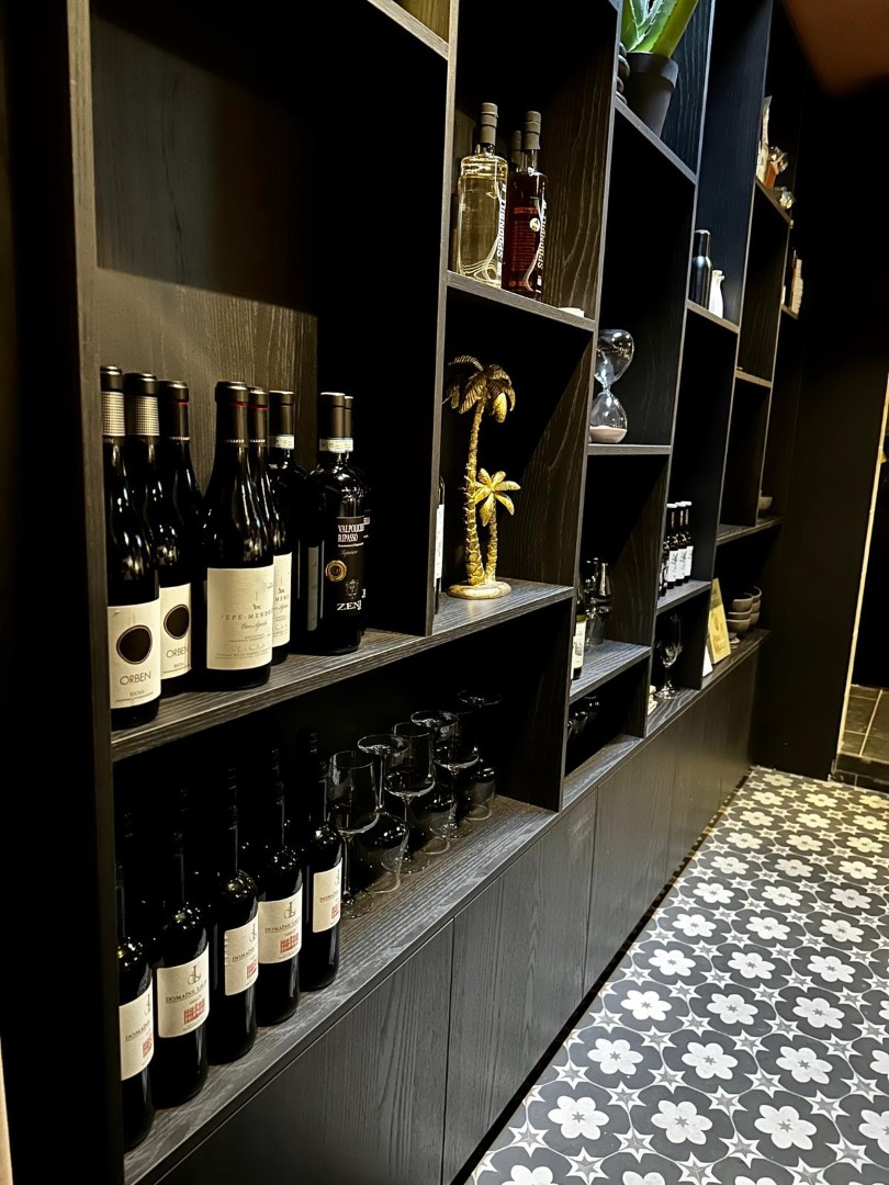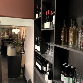 De zaak zelf is warm en stijlvol ingericht. Bij binnenkomst komt men direct in de verkoopruimte met gezellige tafels en een comfortabele zitbank langs de muur. Het tweede gedeelte van het restaurant ligt iets lager en is bereikbaar via een klein trappetje, wat zorgt voor een intieme sfeer — ideaal voor besloten diners of grotere gezelschappen. Aan de achterzijde, bereikbaar met een korte trap omhoog, bevindt zich de professioneel uitgeruste keuken die volledig is ingericht voor een volwaardige exploitatie.