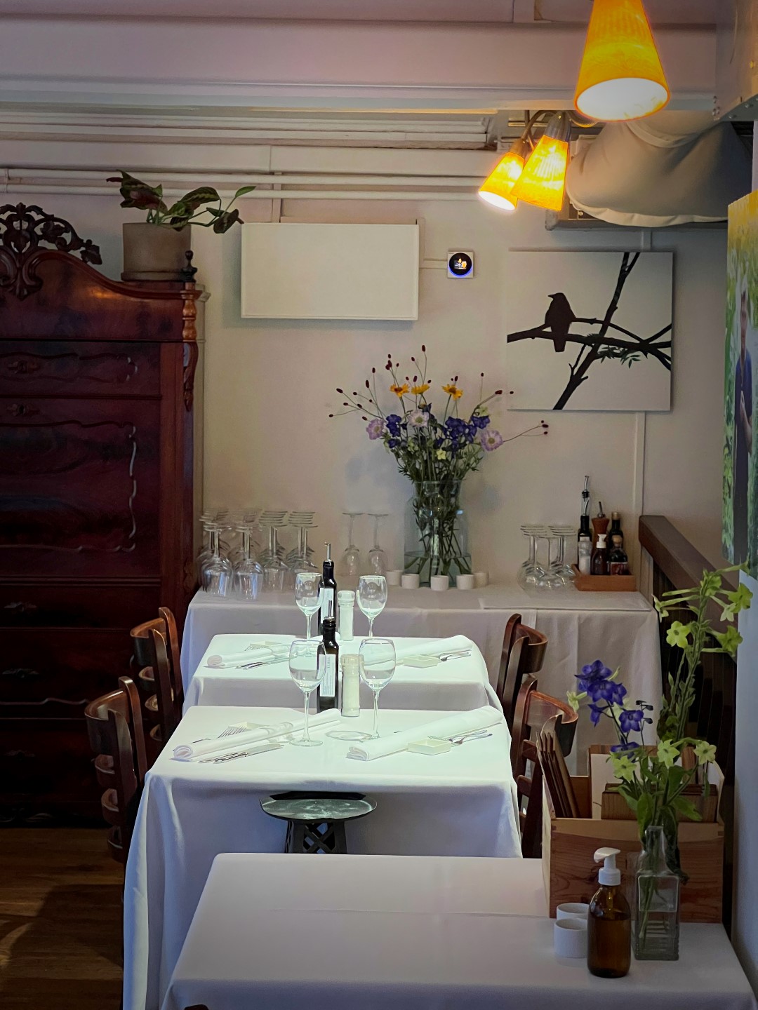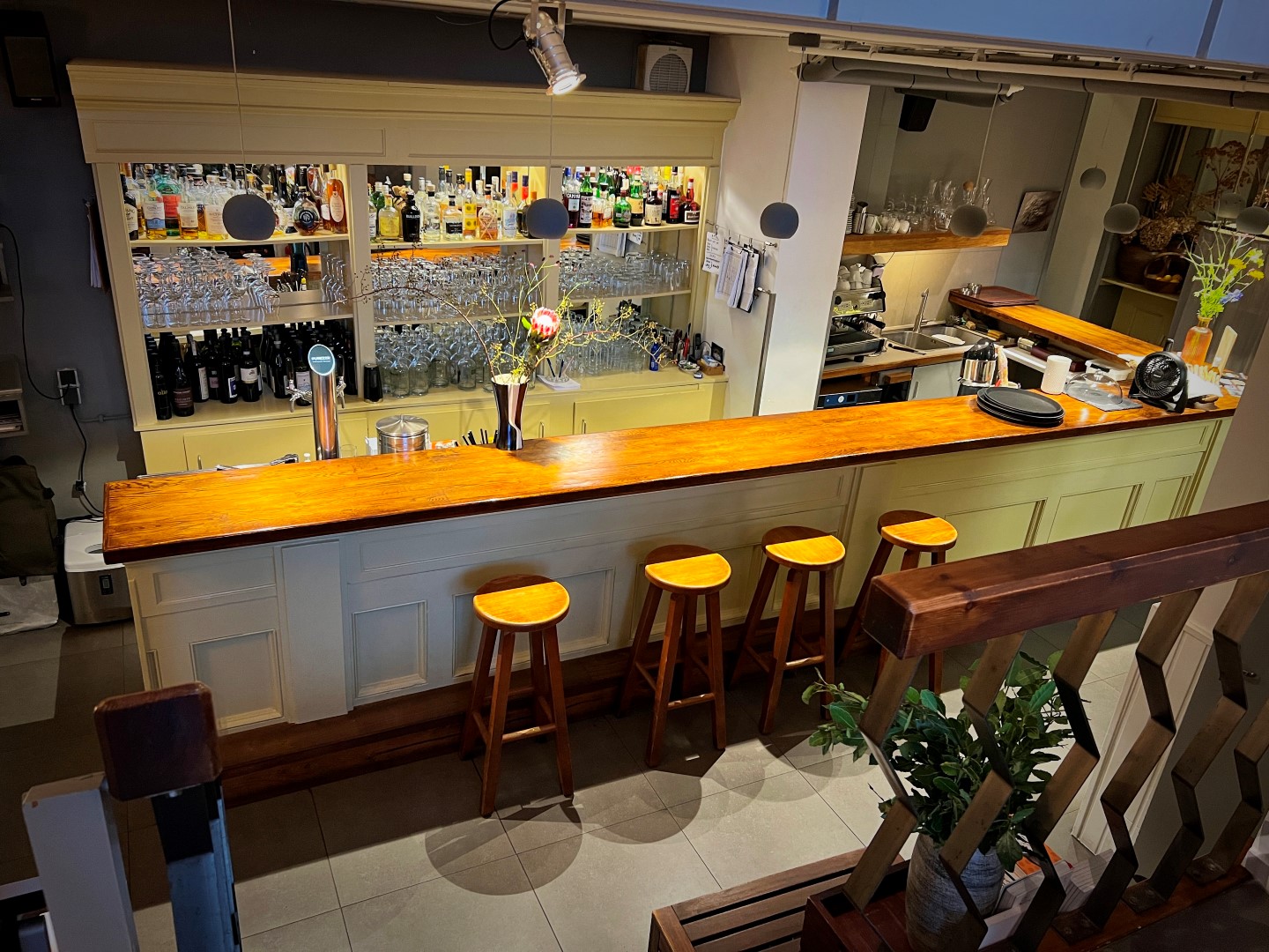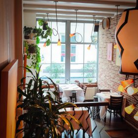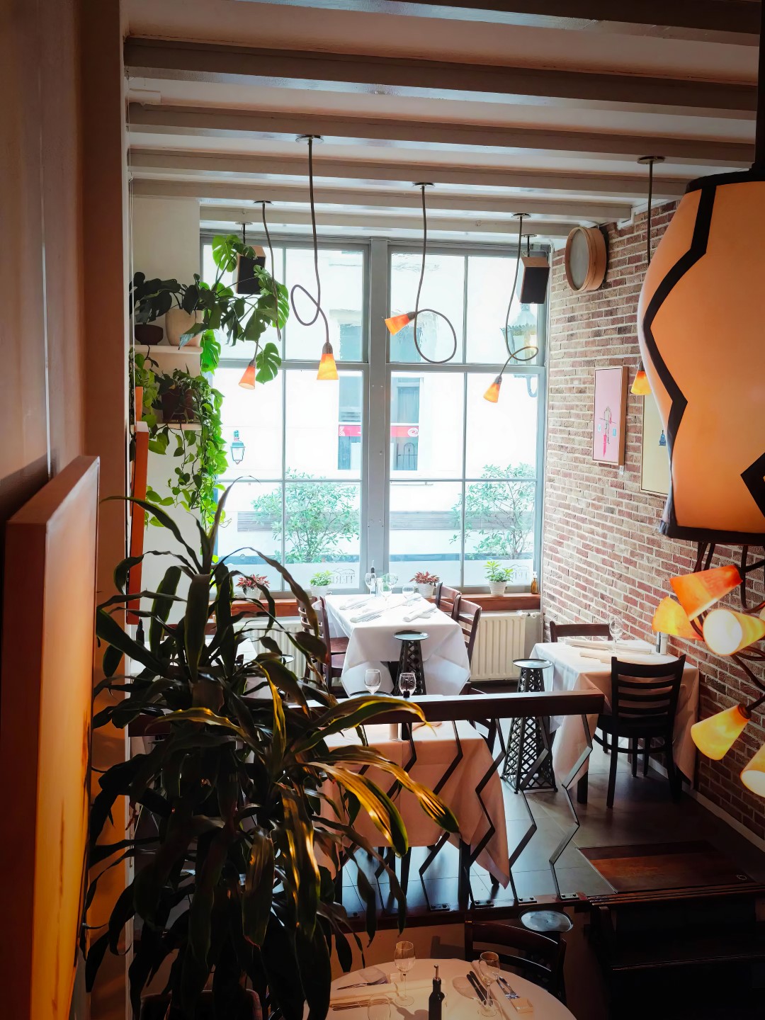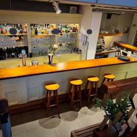 De indeling is speels en gelaagd, met een prettige natuurlijke lichtinval door de open opzet van het restaurant. De zitplaatsen zijn verdeeld over de begane grond en een entresol, wat zorgt voor een levendige en open sfeer. In het souterrain bevindt zich een ruime opslagruimte en de keuken is compleet ingericht en praktisch ingedeeld.